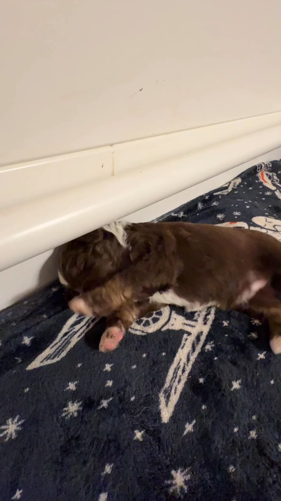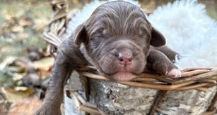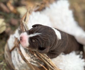 One petite chocolate female still available from our gorgeous litter. Projected 35–40 lbs grown, loose wavy easy-care coat, full Irish white markings, sweetest personality in the bunch. Ready for her family right before Christmas. Message for details!”