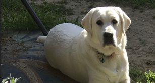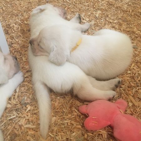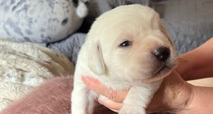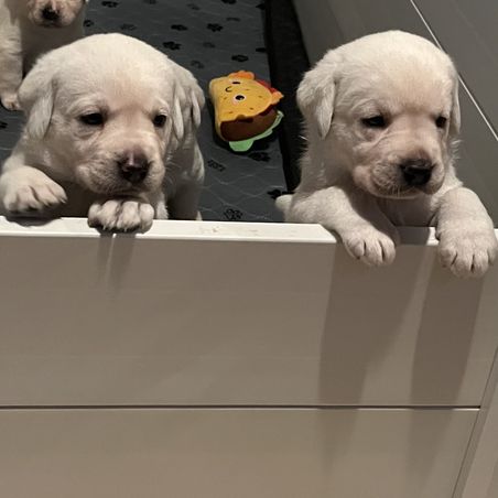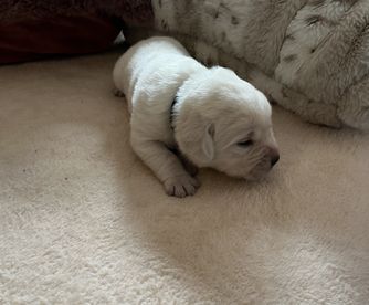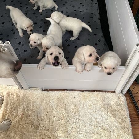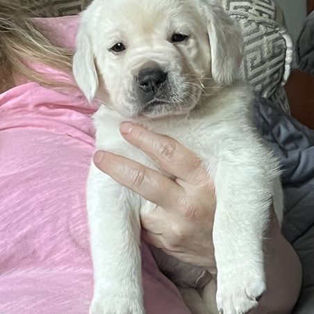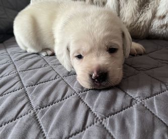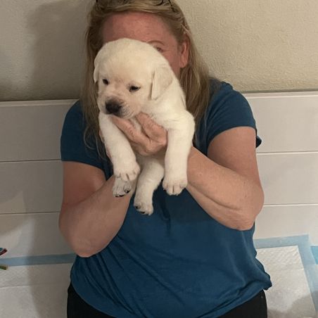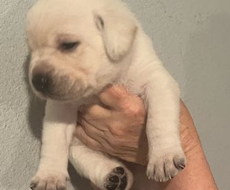 Sammie is a polar white akc English Labador. She is smart attentive, friendly, loves dogs and people . She has a thick tail ,stocky body, big head . Sammie has championship blood line in her linage