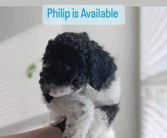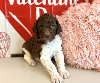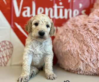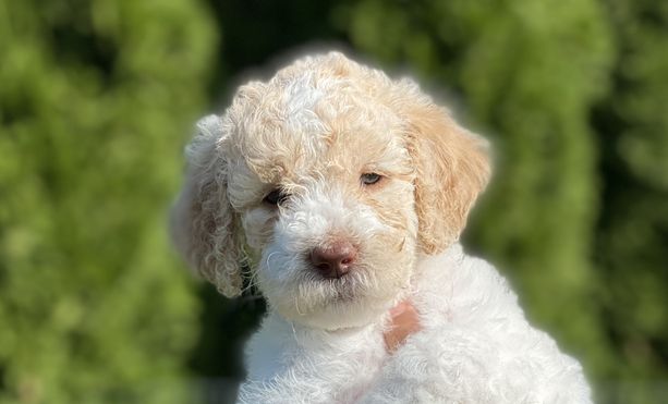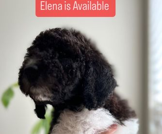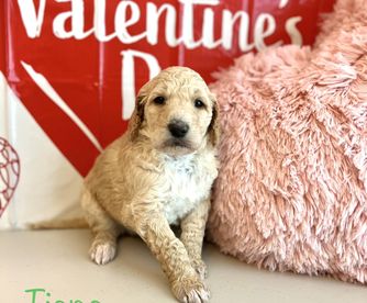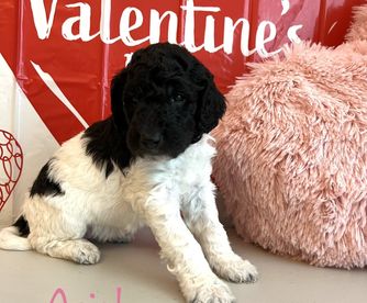 Our Poodle puppies are parti. Goldendoodle puppies include cream, apricot, black, and parti. Colors will vary depending on the parent dogs.