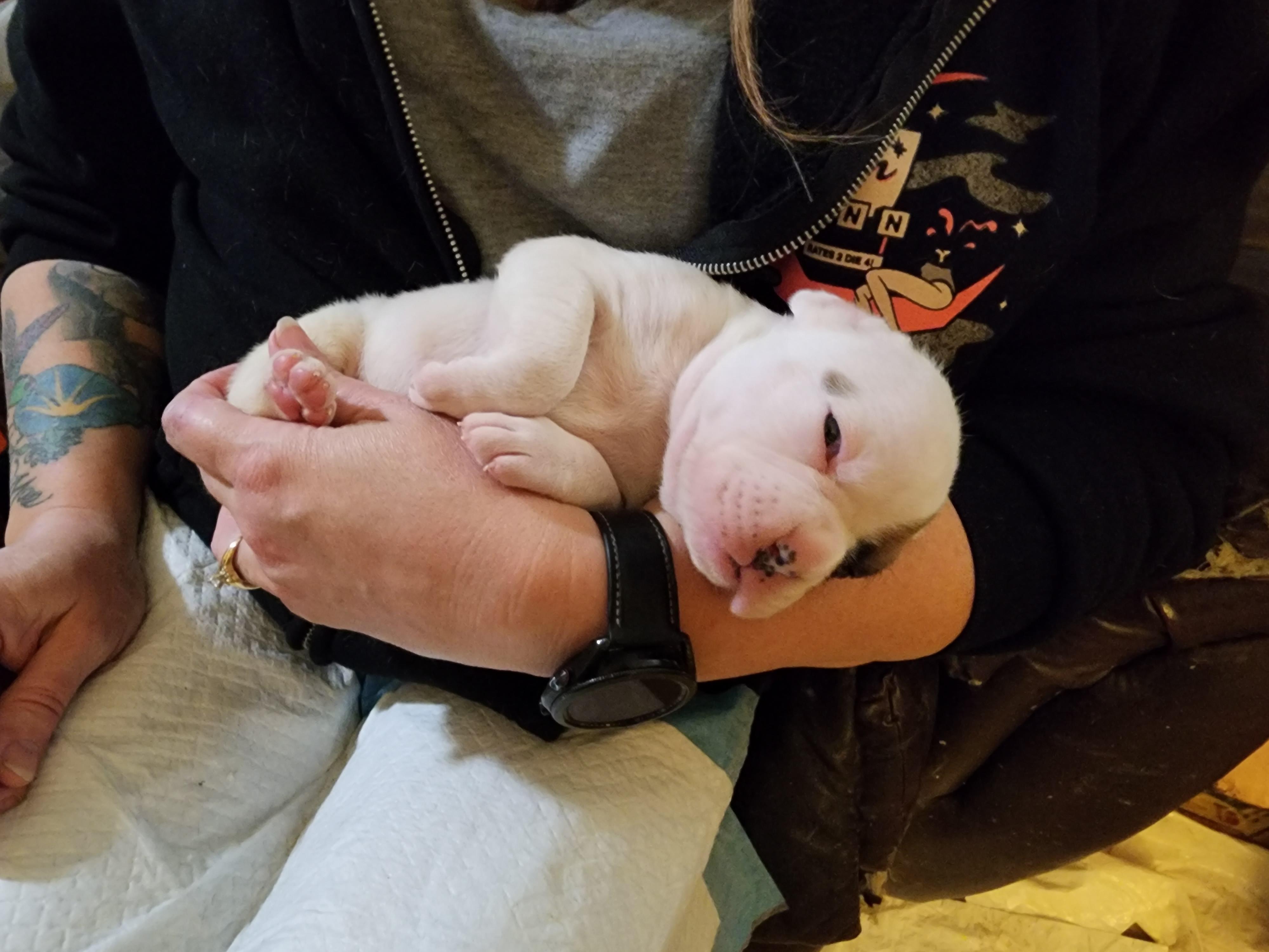 “This includes the puppy, microchip, tail docked by the vet as well as 1st shot, deworming. Our puppies go home with an actual bag of food, toys & more. Puppies are vet checked. Contact me anytime. Deposit is transferable.”