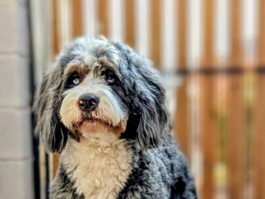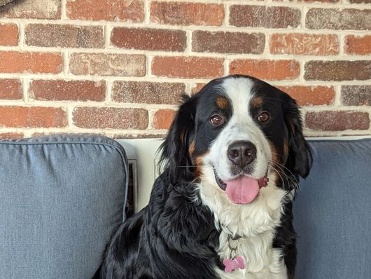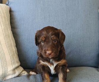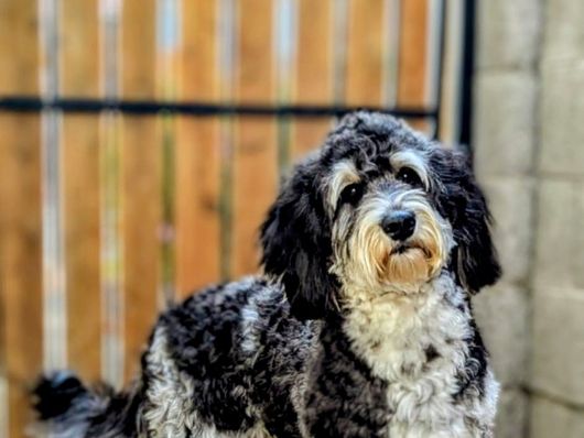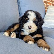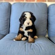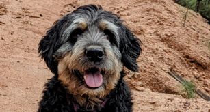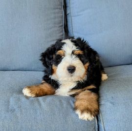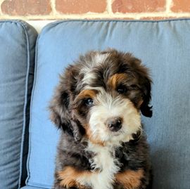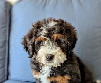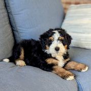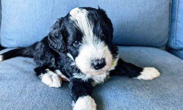 Zoey is our 50 lbs ultra bernedoodle Mom, 70% Bernese 30% poodle. Her structure and temperament both show off the amazing qualities of the Bernese Mountain Dog we all love! Zoey is easy going, loves to chill on the couch or go on an adventure, and absolutely adores her humans! Zoey makes us laugh every day with her goofy personality! She is eager to please and doesn't have the common stubbornness found in most Bernese. She lives with our other Bernedoodle mom, Pepper, and her family of 7 in Arizona.