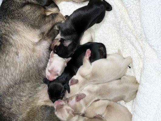 Our puppies include cream, black, chocolate, wild boar and cream, black and tan, chocolate and cream, and black and cream. Colors will vary depending on the parent dogs.