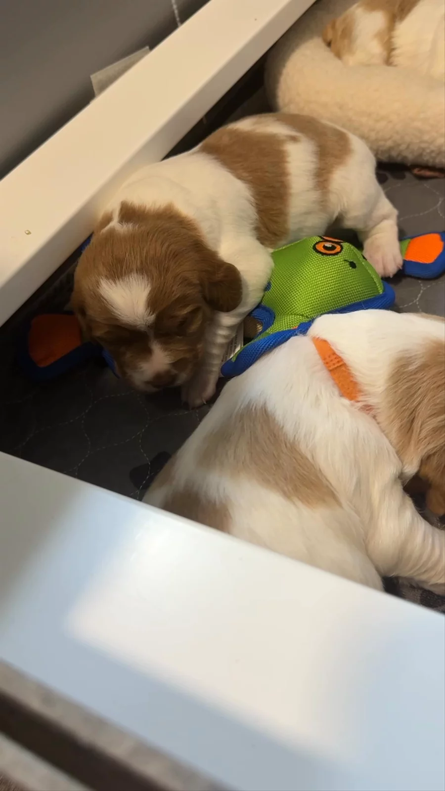 Puppies are moving around a lot more and starting to mouth and play with eachother