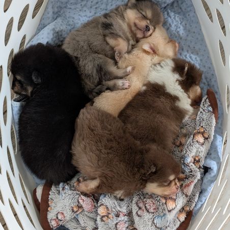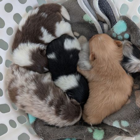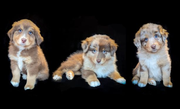 Our Pomeranian puppies include cream, black, blue, chocolate, cream sable, chocolate sable, chocolate merle, chocolate and tan, blue sable, blue and tan, blue merle, and black and tan. Australian Shepherd puppies include red merle, blue merle, black tri-color, and red tri-color. Colors will vary depending on the parent dogs.