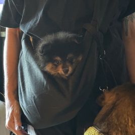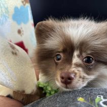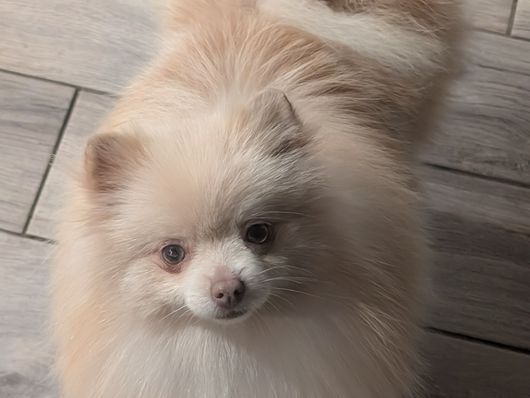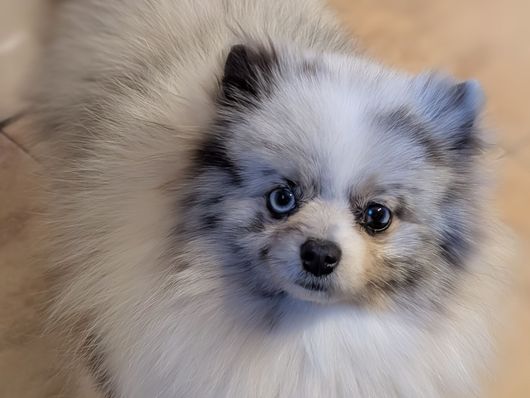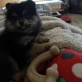 Megan was VERY patient with me and the Murphy's Law-type technical difficulties I was having. I'd been devastated by the loss of my 12 yr. old Pom, and this amazing puppy has made the sun come out and the birds sing again. I live in a mother-in-law's apt. at my son and his family's house. We are all wild about PoPo (Indiana). They are constantly dropping in to see me...I mean PoPo (lol). Megan did an awesome job giving her a great foundation. She is confident, loving, outgoing, determined, smart, healthy and stinkin' adorable! She sleeps in a wire crate mattress height next to my bed. The first night she cried but calmed right down and fell asleep when I shhh'd her and put a couple fingers in the crate. I covered the crate w/blankets except for the side facing me. She's been quiet ever since. She's catching on to potty training on potty pads, and it's only been 4 days. She runs over to the cabinet where her treats are after getting clicked for a good potty. It's not fool proof yet, but she learned to sit in a couple minutes. Maybe Megan worked on that? I'm just amazed at how confident and bright she is. I'm also grateful that Megan does Embark genetic health testing. That brings great peace of mind. Thank you, Megan, for making sure your puppies get everything they need to grow into secure, happy, healthy dogs!