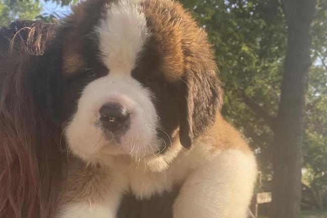Our Saint Bernard puppies include brown and white, orange and white, mahogany and white, and brindle and white. Neapolitan Mastiff puppies include mahogany, tawny, blue, and black. Colors will vary depending on the parent dogs.