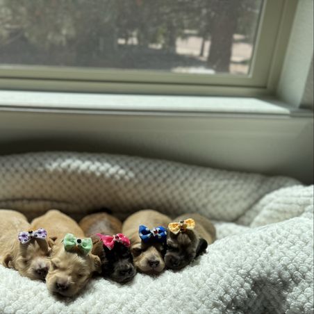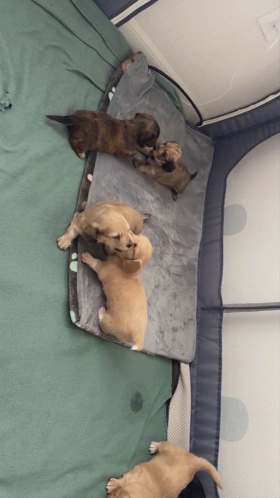 Look at that perfect pup pile!!! They change everyday! Let me introduce this perfect little litter to you all. We have a beautiful little boy and if you check out my page he will be puppy blue. He is supper wiggly. And his markings are Changing everyday! We have a pink little lady and she is a brindle girl. Her markings don’t do her justice in pictures but I will keep trying to capture them! We have a cream boy as well! Mr Green! And he is sooo chunky! He is shiny and vibrant. Then we have our lovely Orange and he reminds me of an Otter. 🦦 look at that cute little nose. Go check em out out and fall in love! I dare you. Because I did 🥰