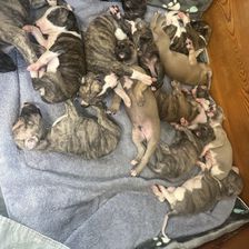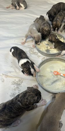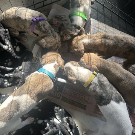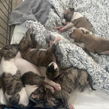 Our puppies include white and fawn brindle, white and fawn, sable, red, red brindle, blue fawn, blue, blue brindle, black brindle, and fawn brindle. Colors will vary depending on the parent dogs.