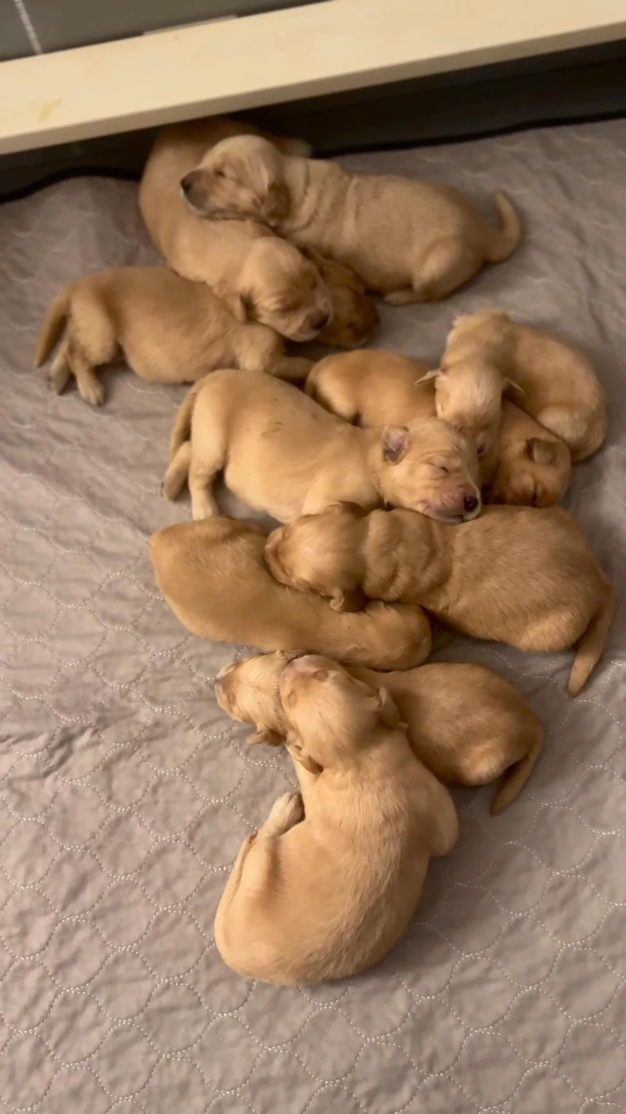 Roadie is our large red male weighing about 75 pounds and on the taller side. He is so sweet, easy to train, and has the quintessential goofy golden personality! Roadie has a lower retrieve drive and is happiest socializing and relaxing. His puppies range from traditional golden to dark red depending on who he is paired with.