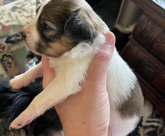 Zloty is a AKC classic Tri, black, white and tan. She is very sweet and affectionate girl and was a dream to housebreak! She is a wonderful mom. She has been tested for PAP-PRA1, PAP-NAD, CFV11, VWD1.