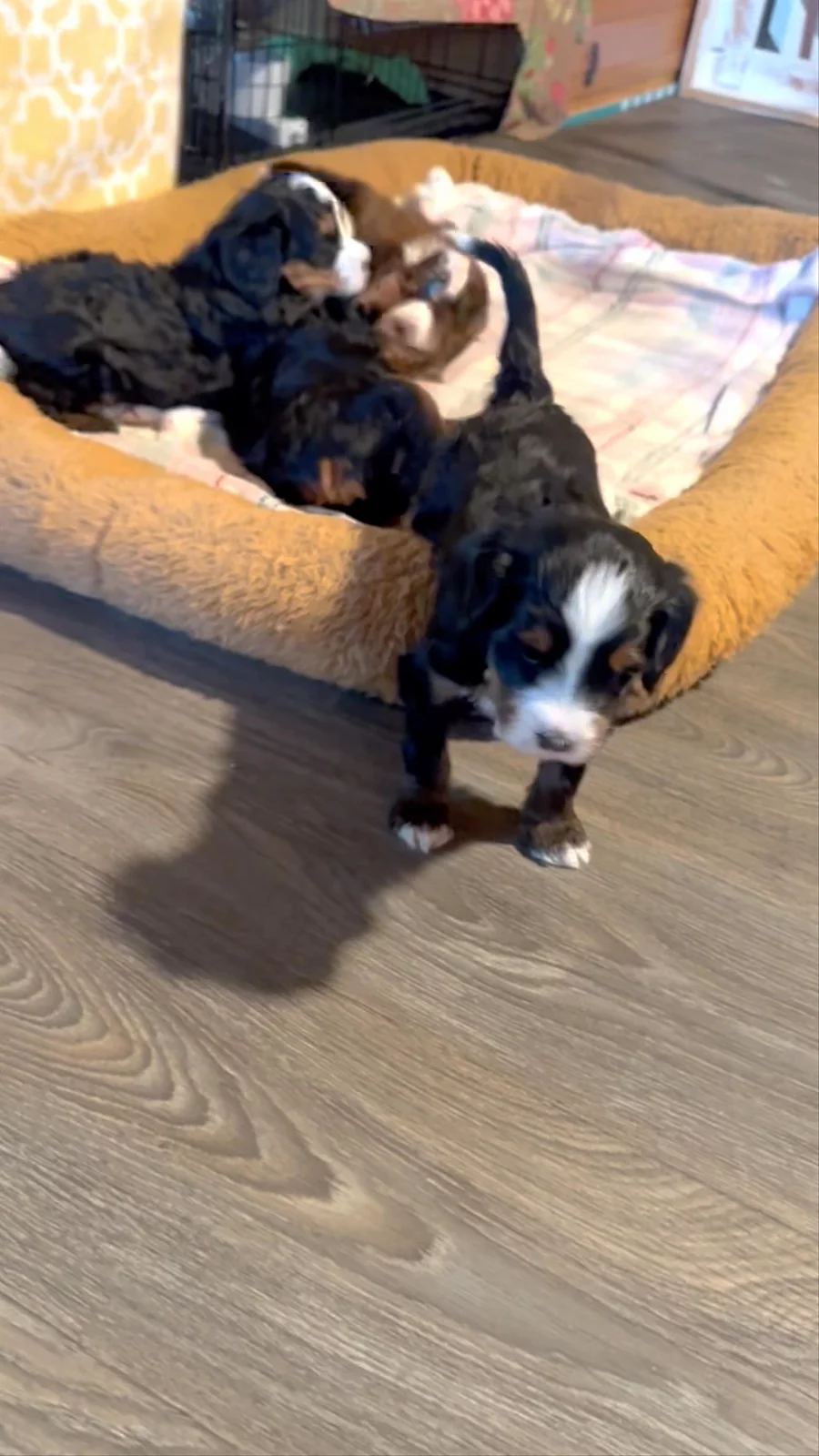 Rozzi is our teeny tiny tri bernedoodle girl. She is 17lb straight non shedding 48 percent Bernese ball of fluff. She has been fully health tested and clear of all testable traits. She has a good PennHIP score. normal OFA elbows, patella, and heart.