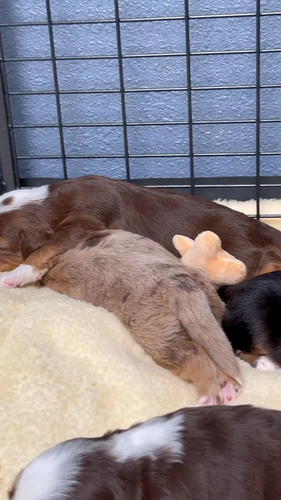 1 blue Merle, 2 brown Merle, 3 brown tri, 4 black tri. This is how we’ve been able to keep track of all these pups when counting them a hundred times a day.