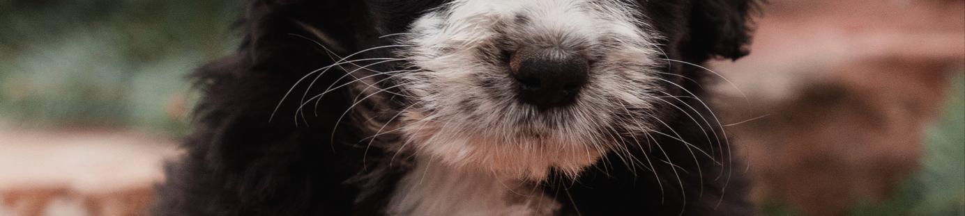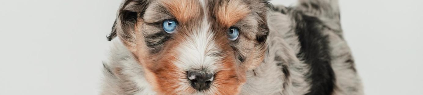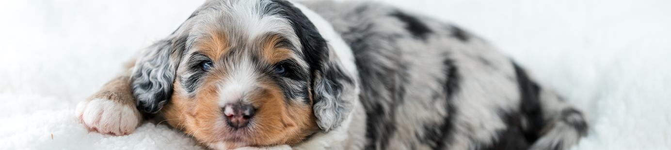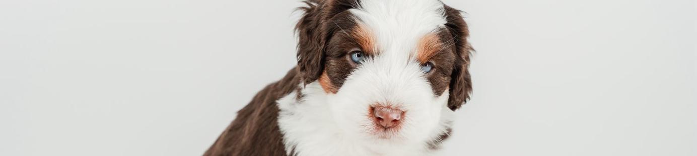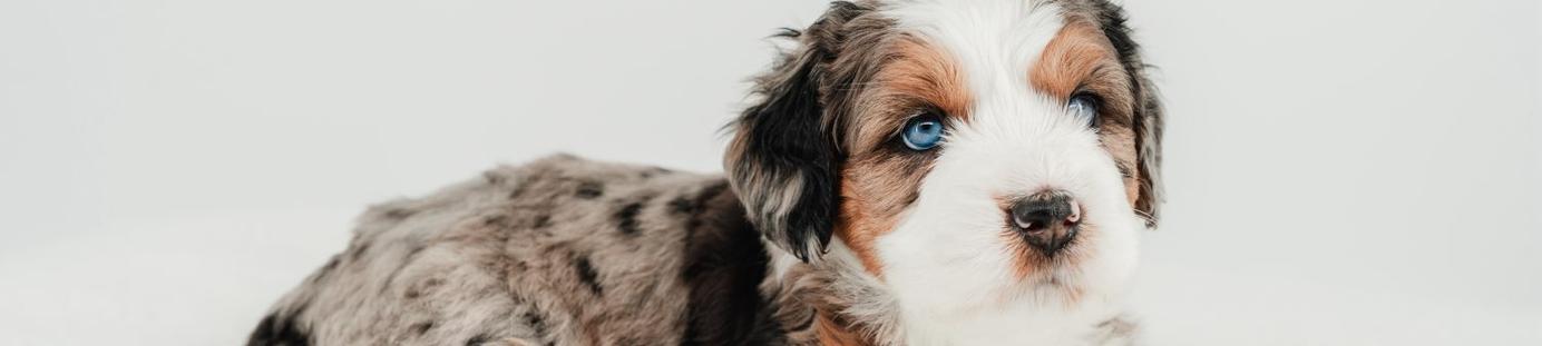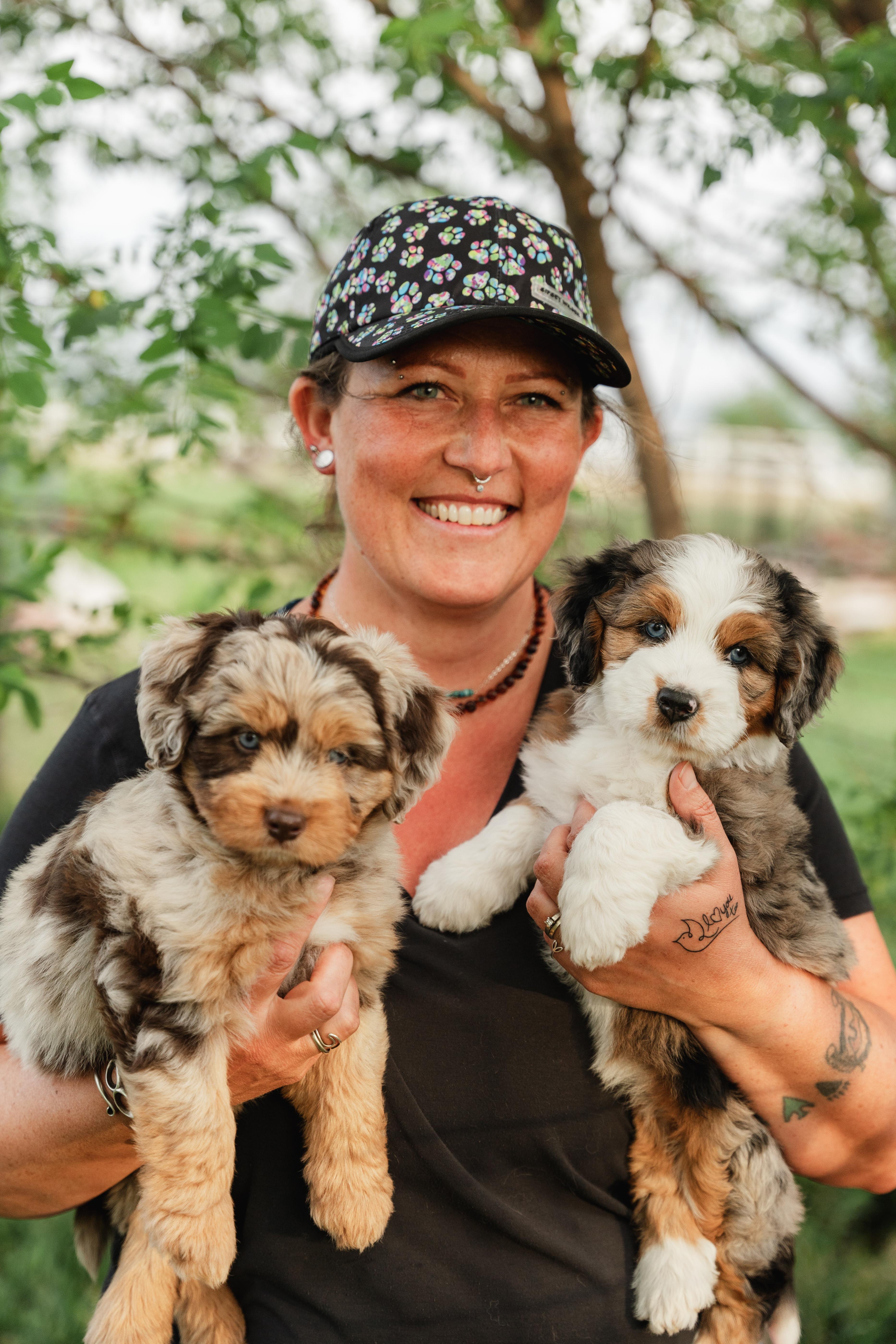 Bernedoodle puppies include brown and white, sable, black and white, and blue merle. Aussiedoodle puppies include brown and white, blue merle, red merle, black and white, black tri-color, red phantom, and red tri-color. Colors will vary depending on the parent dogs.