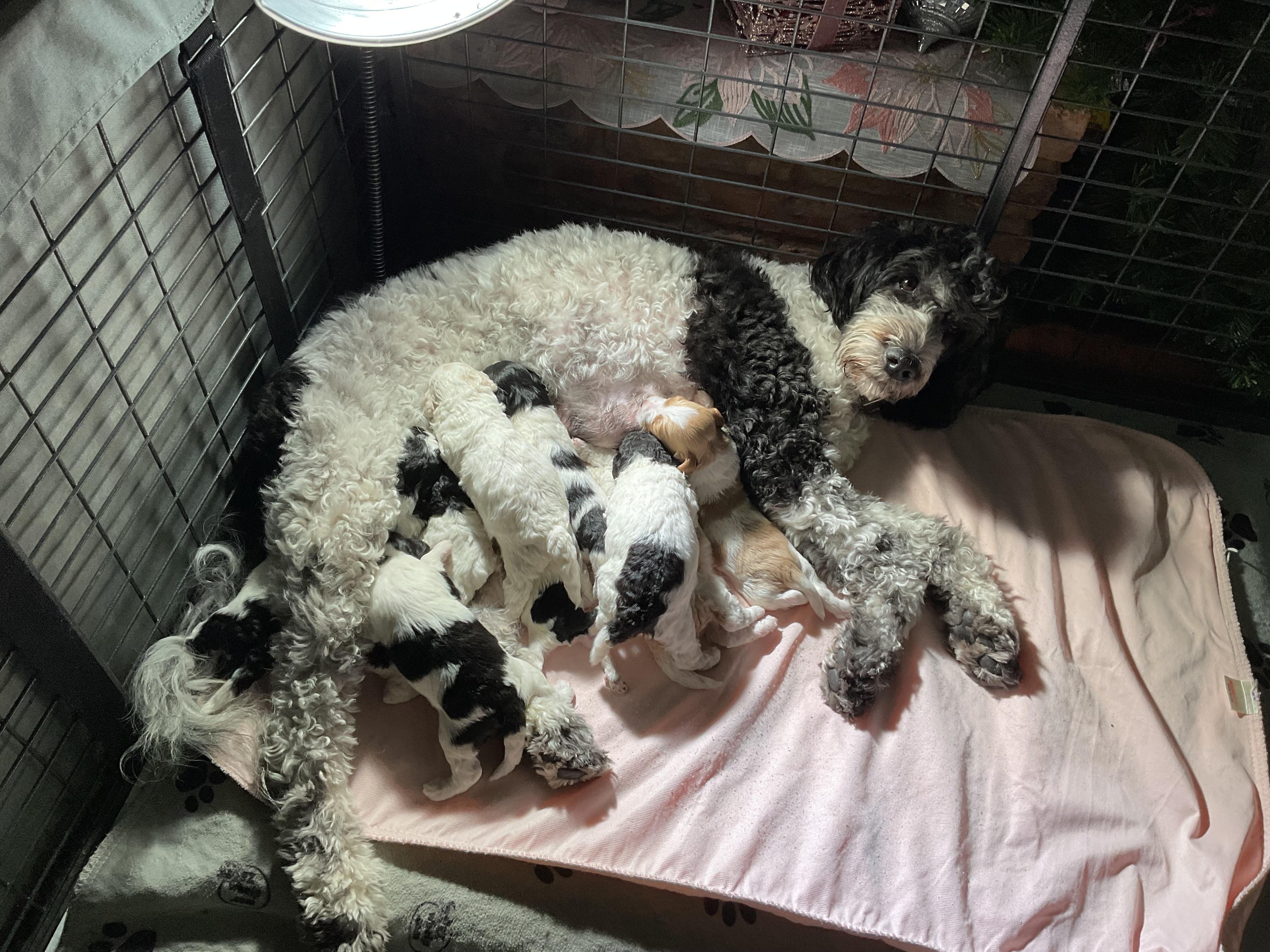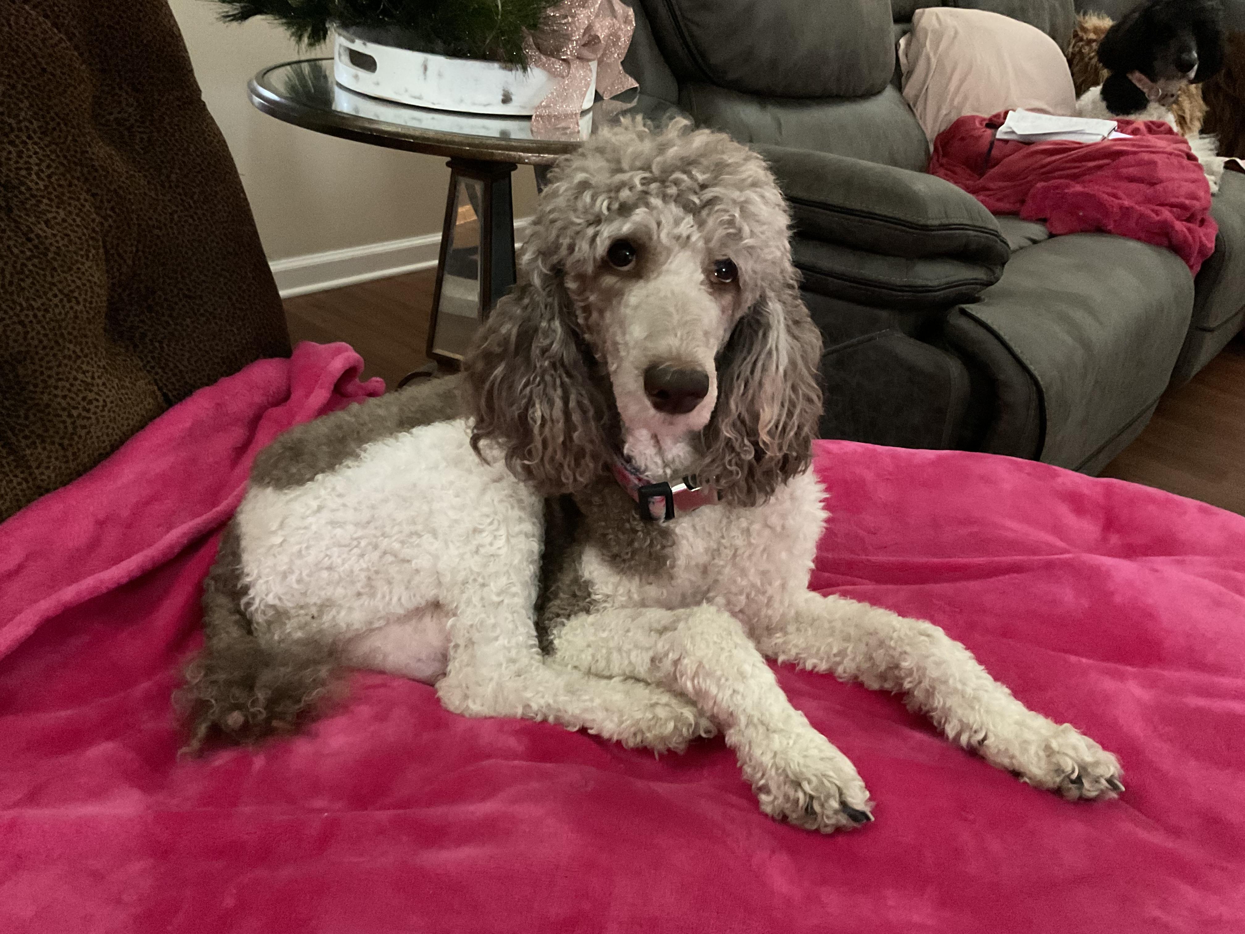 Small Standard Poodle who is the best Momma. She has had three other litters that are the best puppies. Several people have gotten a 2nd doodle from her litters. She is so sweet and I swear she has never done anything wrong! She is the perfect girl!