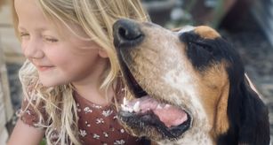 89% European. River is a sweet, curious dog! She loves her family and the farm—especially the horses. River is a feminine, docile gal with lots of beautiful ticking! She’s wonderful with our children and other dogs. River loves a good truck ride checking cows and the crops!