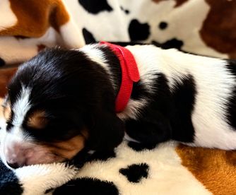 Our puppies include red and white and black brown and white. Colors will vary depending on the parent dogs.