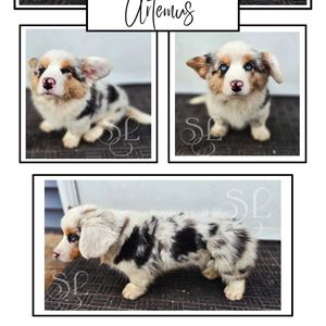 Our Cardigan Welsh Corgi puppies include red merle and white, brindle and white, and blue merle and white. Colors will vary depending on the parent dogs.