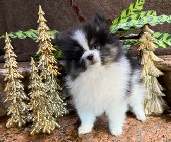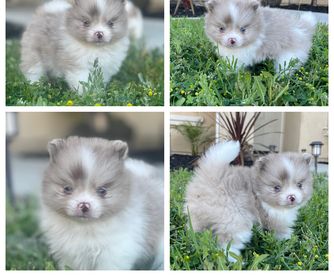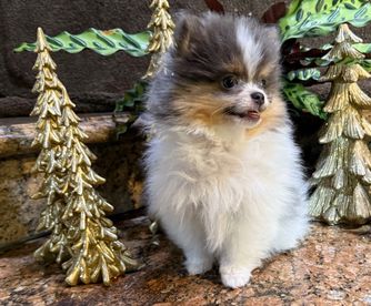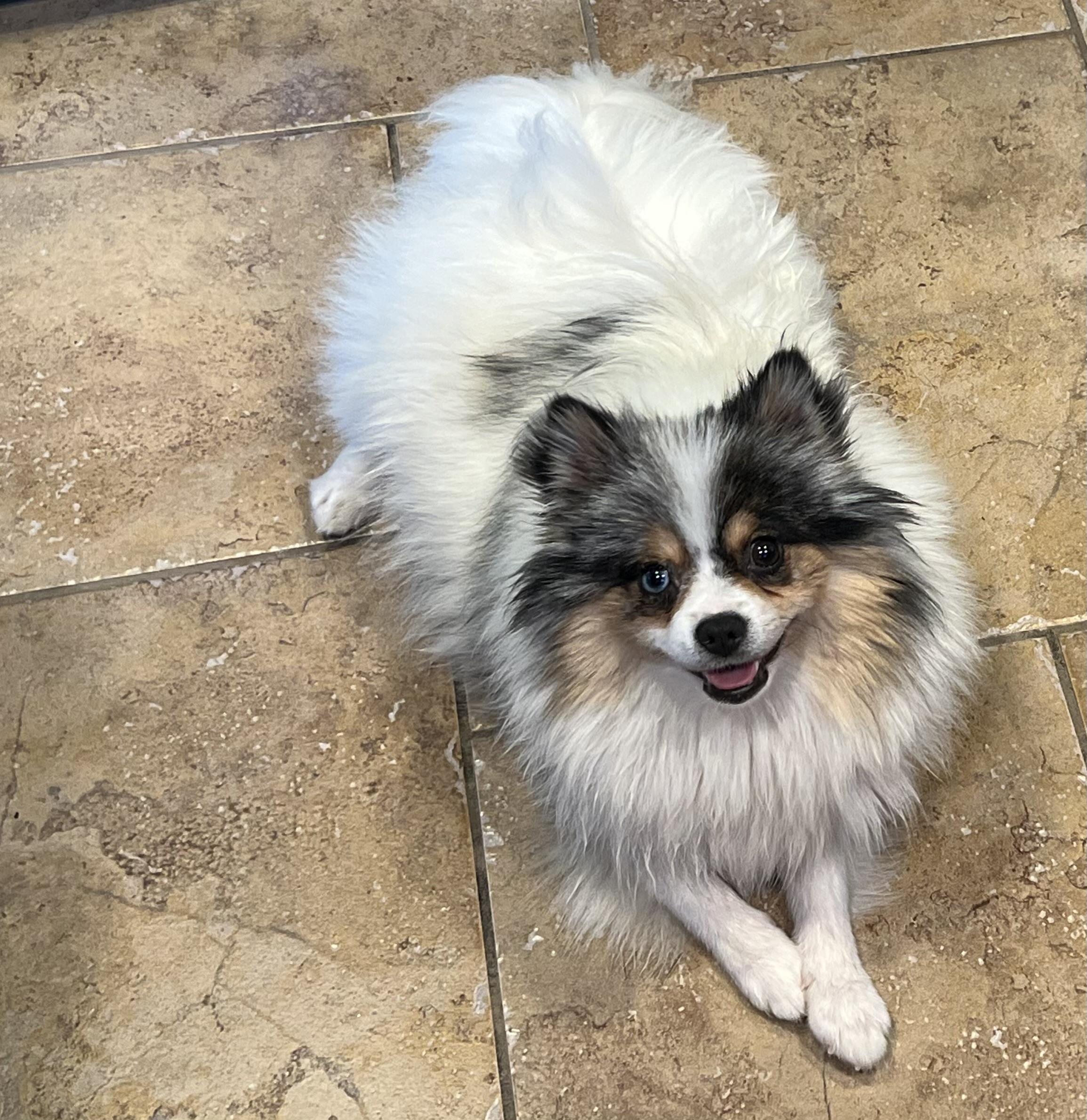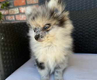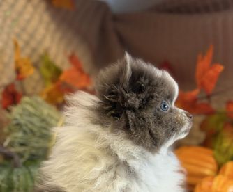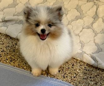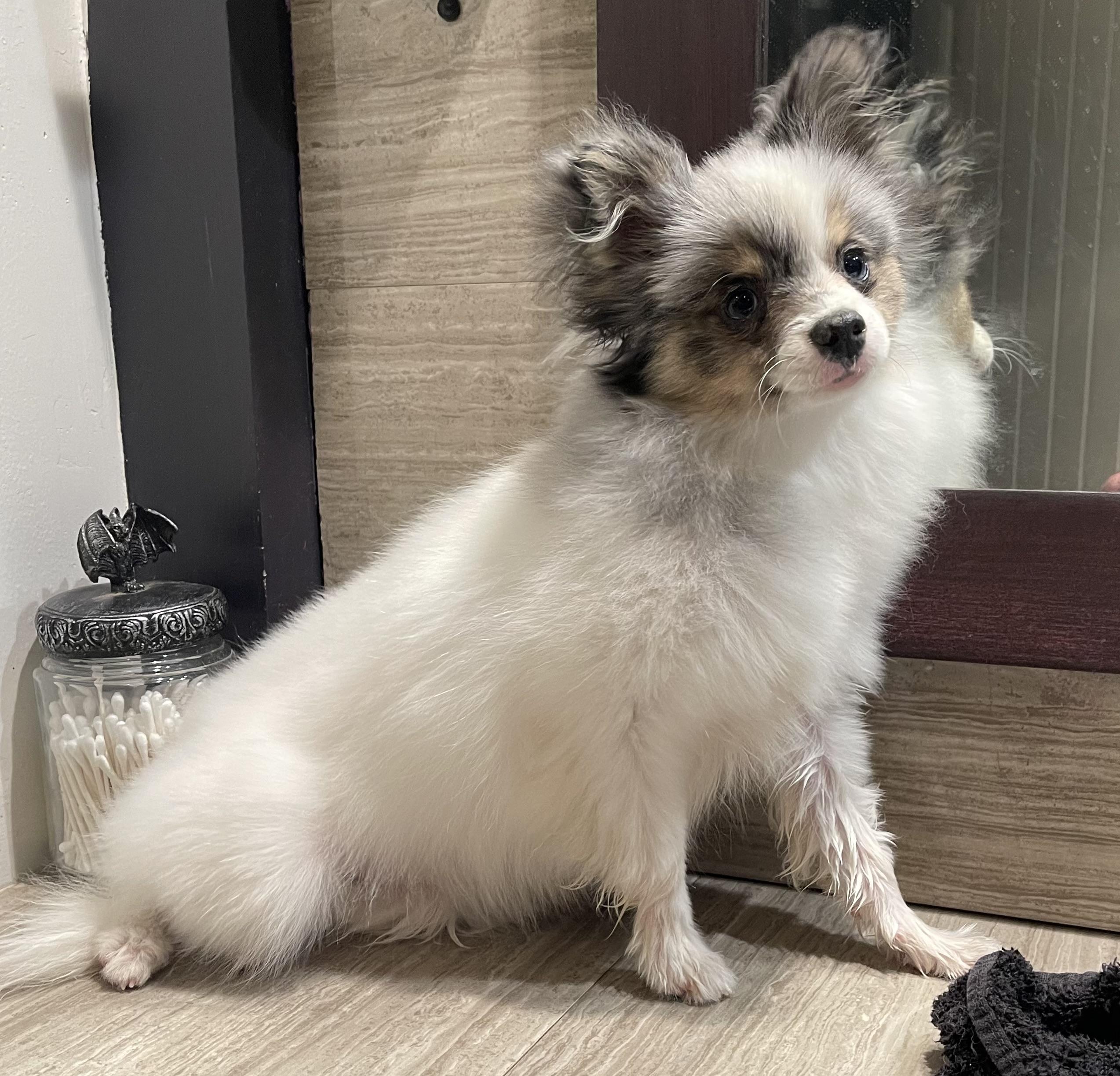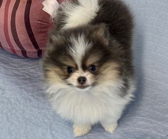 Meet Miss Ava. Ava is a Blue Merle tri Pomeranian. Ava has a bubbly personality and loves to play. Ava is a big cuddle bug and loves to snuggle up with you on the couch. Ava is a very attentive and loving mother to her babies, and produces the best little lovers.