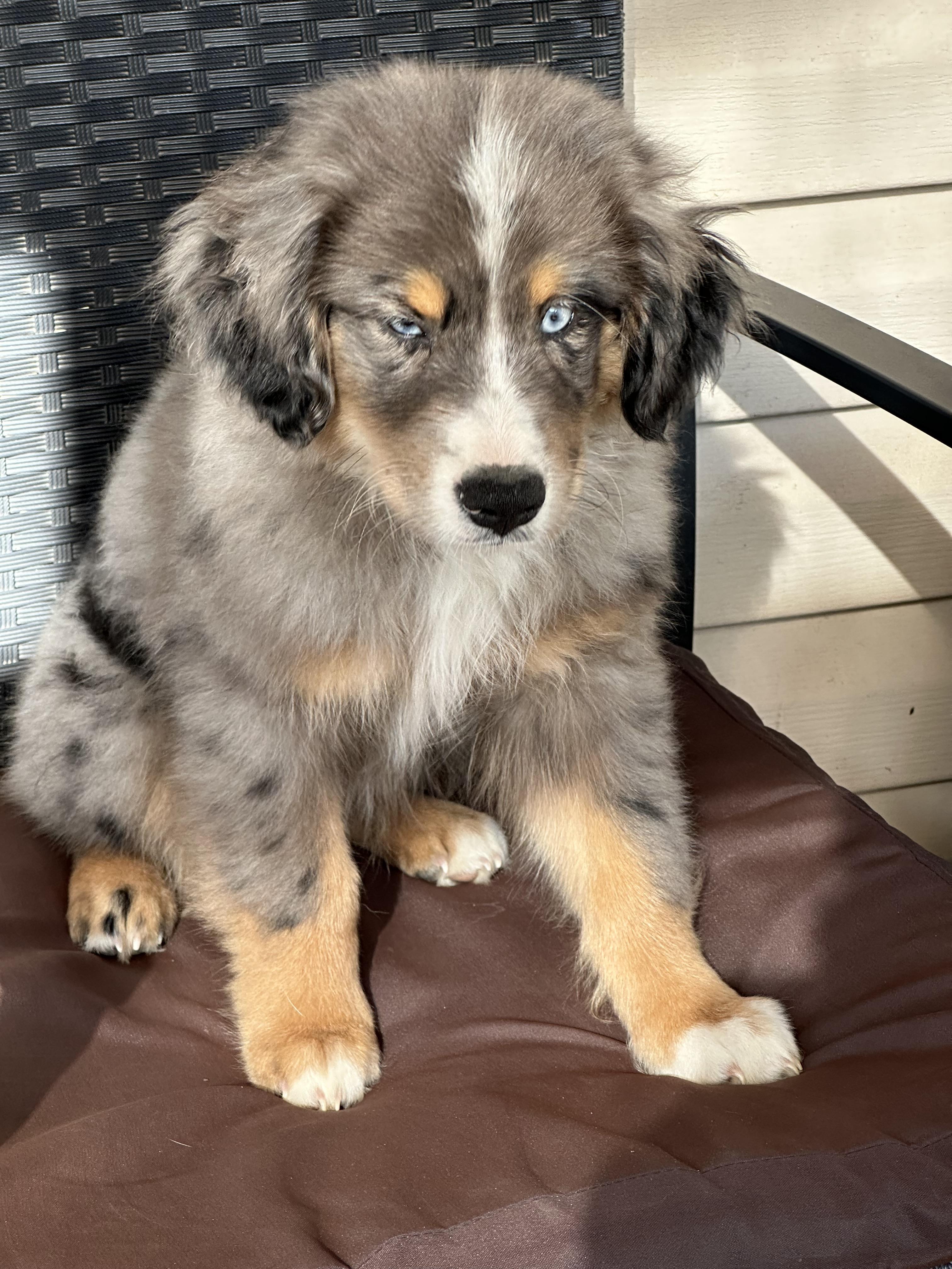Our puppies include blue merle and black tri. Colors will vary depending on the parent dogs.