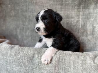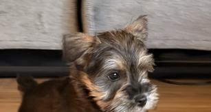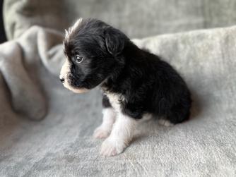 Coffecito is super sweet and loving. He is gentle with the kids, he has hazel eyes and is definitely a looker. He is about 13 lbs , making him the perfect lap dog and bed snuggler! He is a parti colored with brown nose and stick brown markings!
