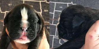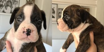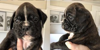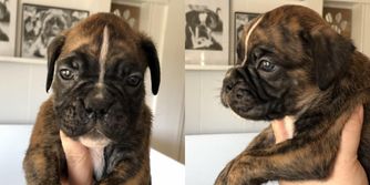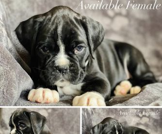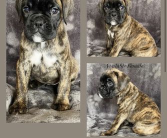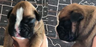 Boxer puppies include fawn, brindle, and white. Colors will vary depending on the parent dogs.