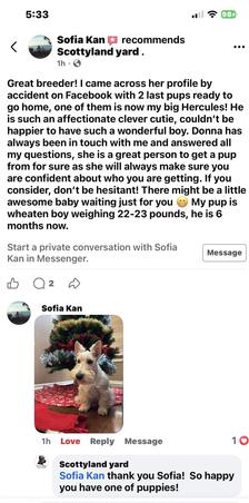 I cant say enough about Donna. I got a wonderful Wheaton Scotty one of the best i have ever had. Donna stayed in touch throughout. She is still texting me today after the purchase and that says a lot. Very very healthy little girl hard time keeping up with her. Just a great experience all around. Also the pet nanny Dennis Wagner very professional class act very reasonable rates. I strongly recommend both the breeder and the pet transport. Tony