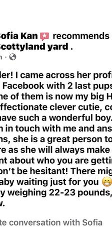 Adopting my first puppy was a truly wonderful experience that I’ll cherish forever. As a first-time dog owner, I was filled with excitement and a bit of nervousness, but Donna of Scottyland Yard made the journey seamless and joyful. From the moment I met my puppy, his soulful eyes melted my heart. Donna and her husband patiently guided me through every step, offering advice on training, nutrition, and creating a loving home. Bringing him home was a life-changing moment, and every day since has been filled with unconditional love, laughter, and countless wagging tails. Thank you Donna and Scottyland Yard Sir is the best Christmas gift ever. With all my heart, Shaun