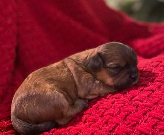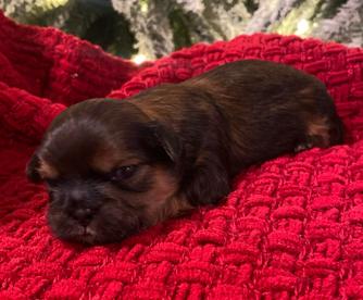 Flicka May is a sweet little momma. She is smaller in stature and is around 8lbs. She is the daughter of our retired sire Jackson and Macie Bean! She has the sweetest personality. Shes on the quiet side and just loves to sit beside you all day and be loved on!