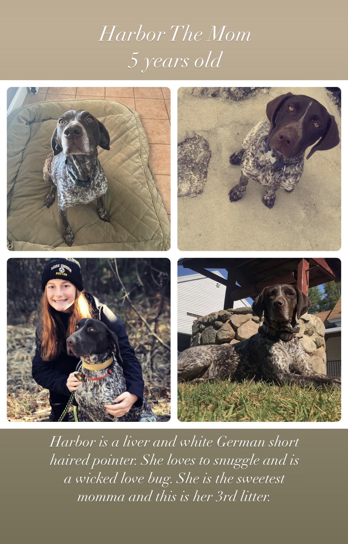 Harbor is a female German Shorthaired Pointer. Carefully selected as a great representative of her breed, Tara decided to make her part of their program. Tara has passed Good Dog’s screening process, which involved a review of their breeding practices, environment, and the mental and physical health of their dogs.