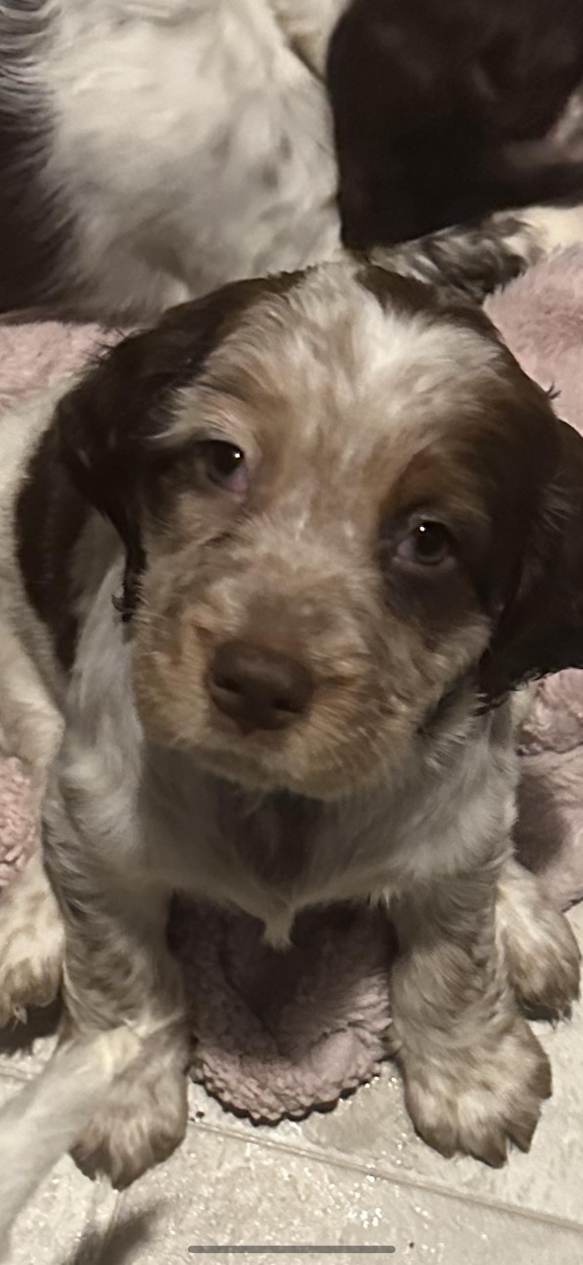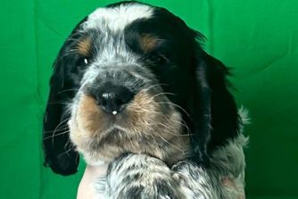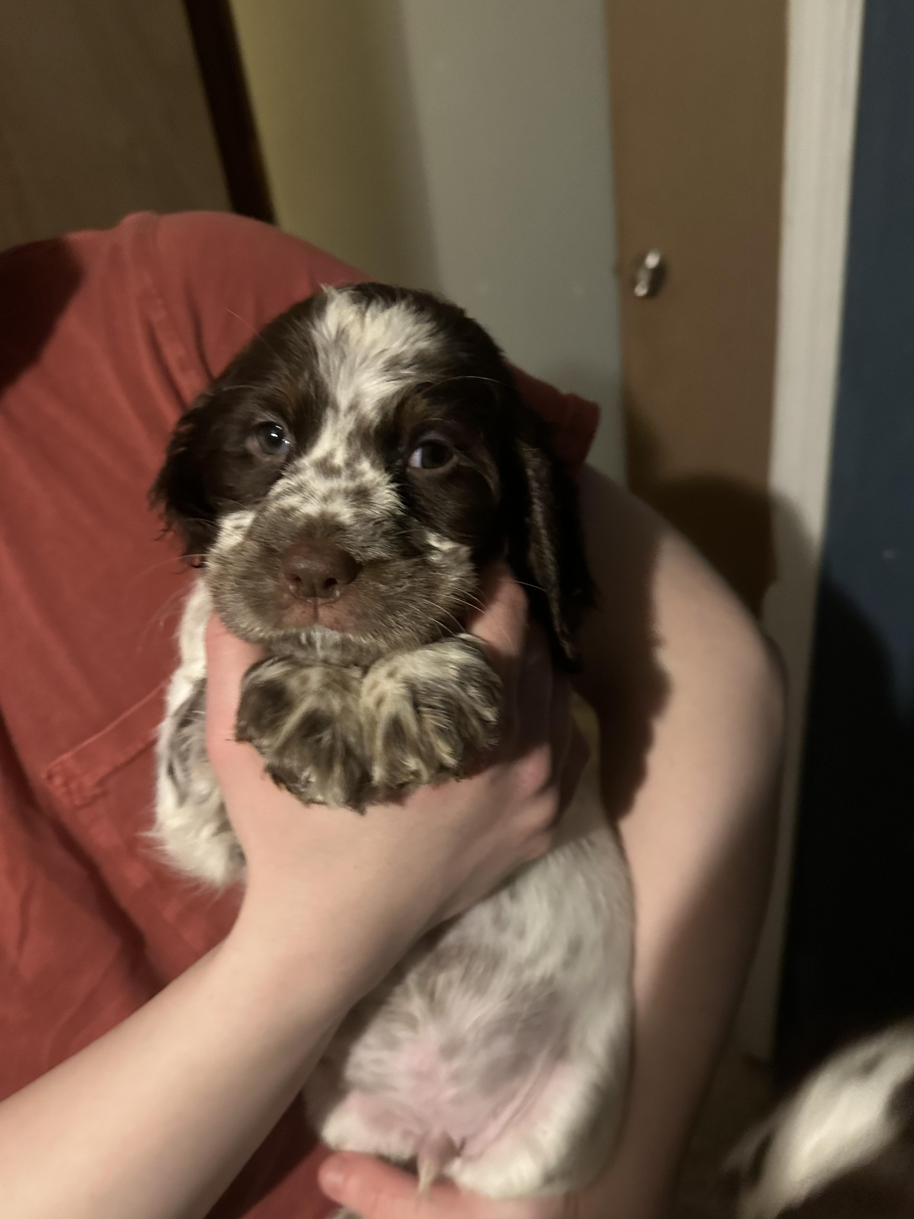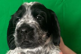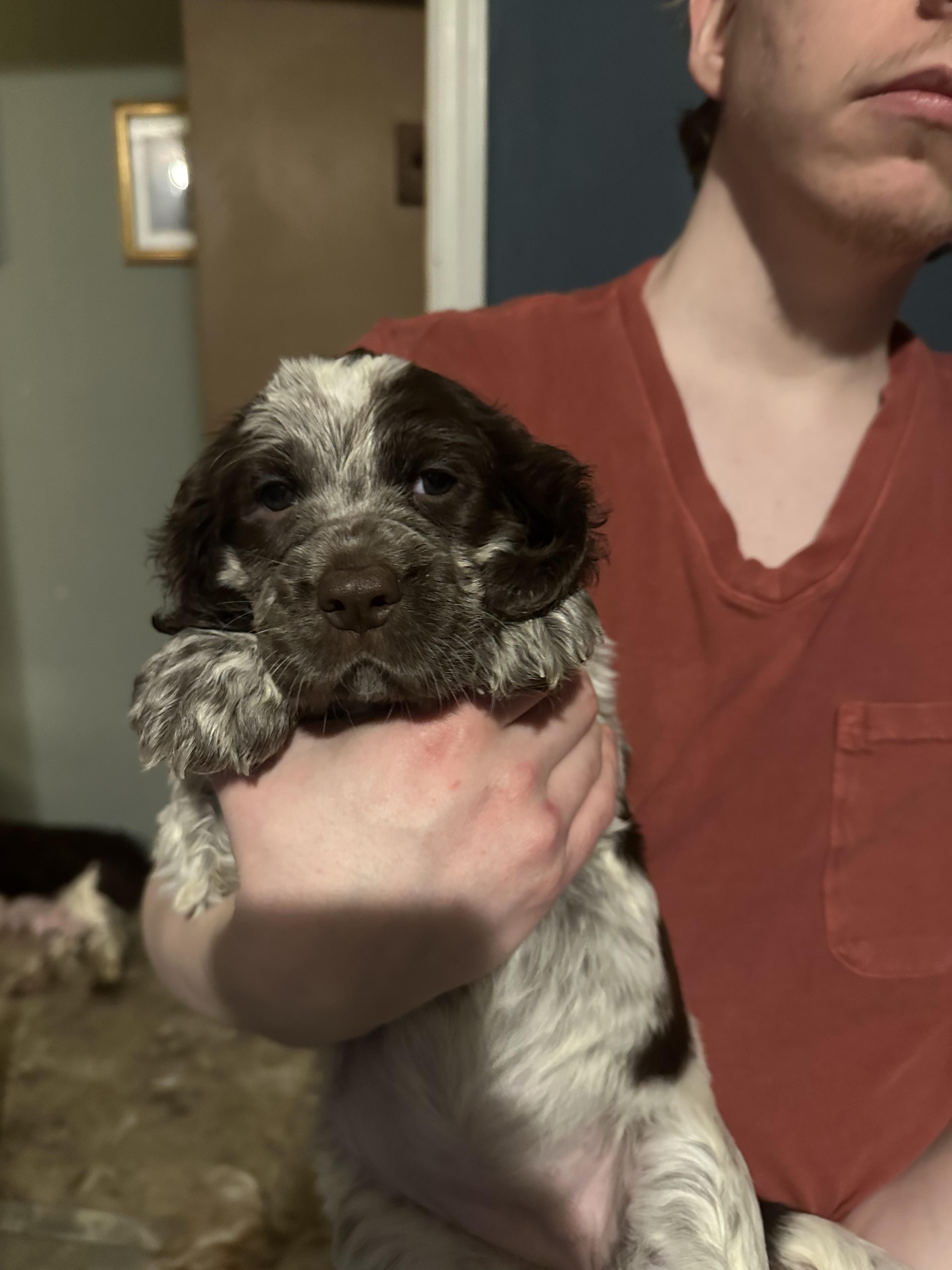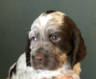 Heavily ticked white and liver. Big boned European bloodlines. He sings