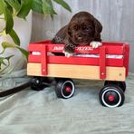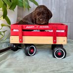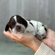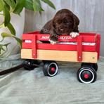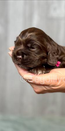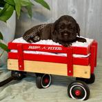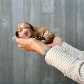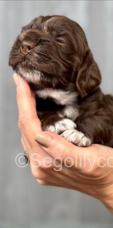 Dallas is our handsome chocolate boy with the cutest white-dipped front paws, a snowy white chin, and a little patch on his chest that adds just the right amount of charm. He’s a well-fed, happy pup, always the first to find his way to the milk bar! Dallas was also the first to open his eyes and start wobbling around, already showing off his confident and curious nature. He’s a total cuddlebug and loves nothing more than being snuggled up in your arms.