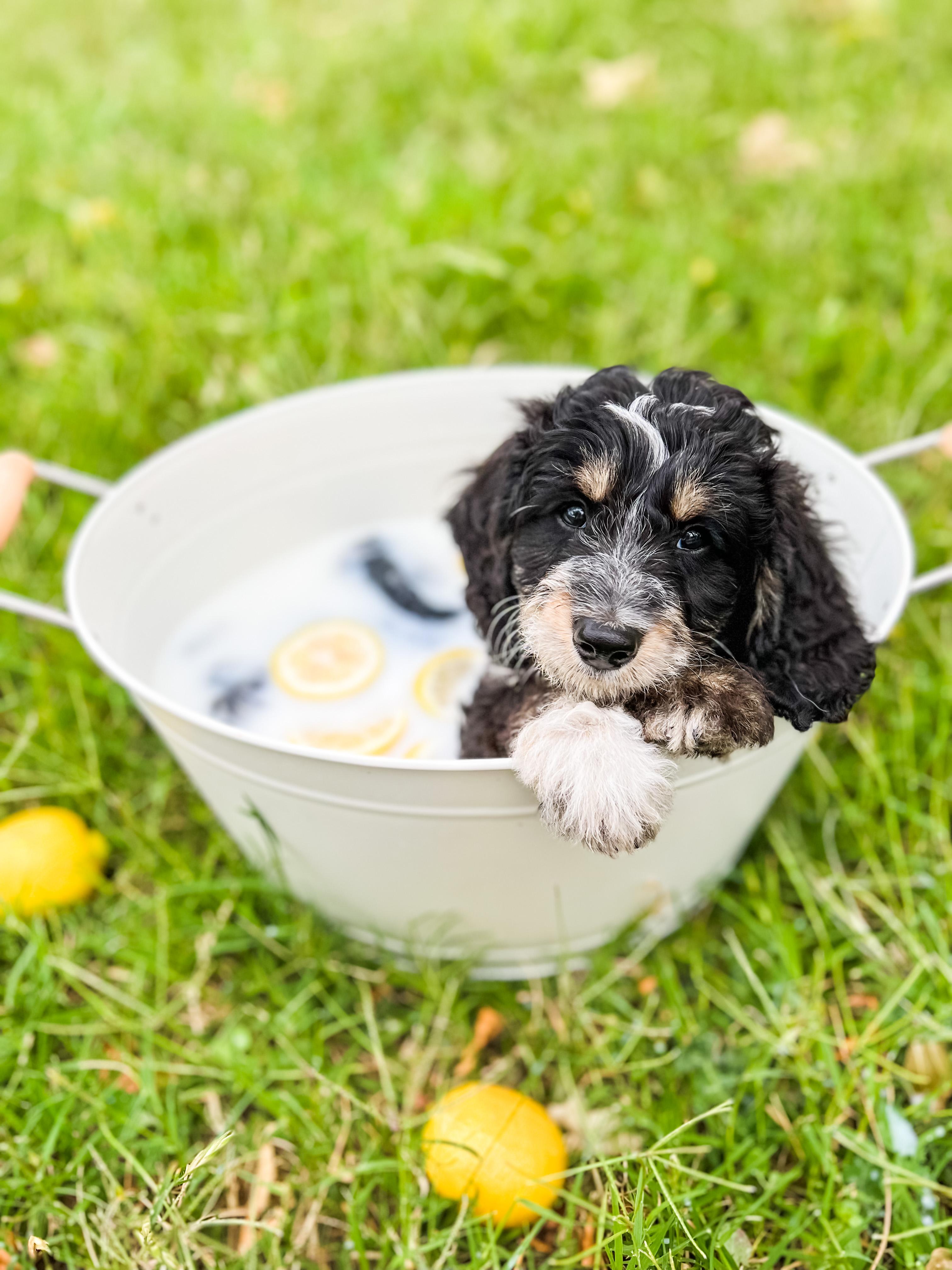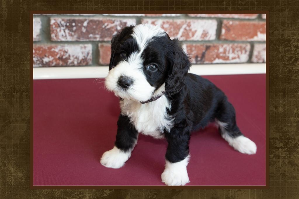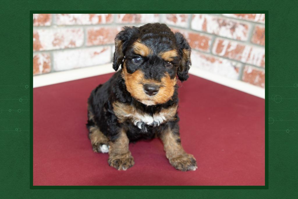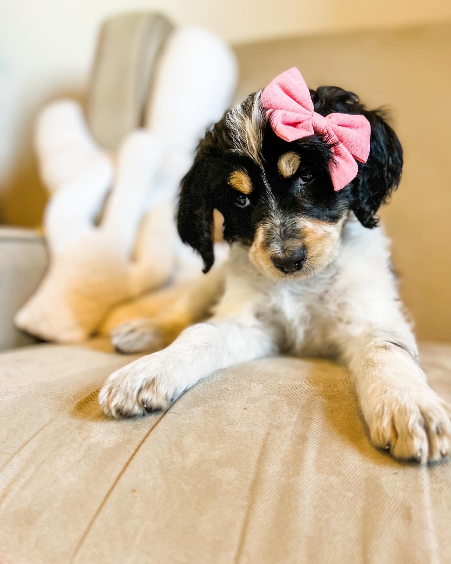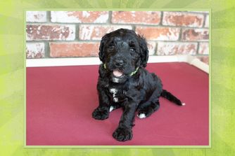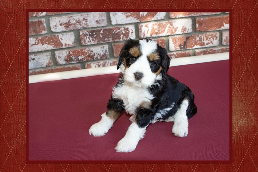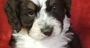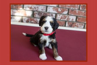 Our Australian Labradoodle puppies include caramel, red, and apricot. Bernedoodle puppies include black and white and tri-color. Colors will vary depending on the parent dogs.