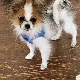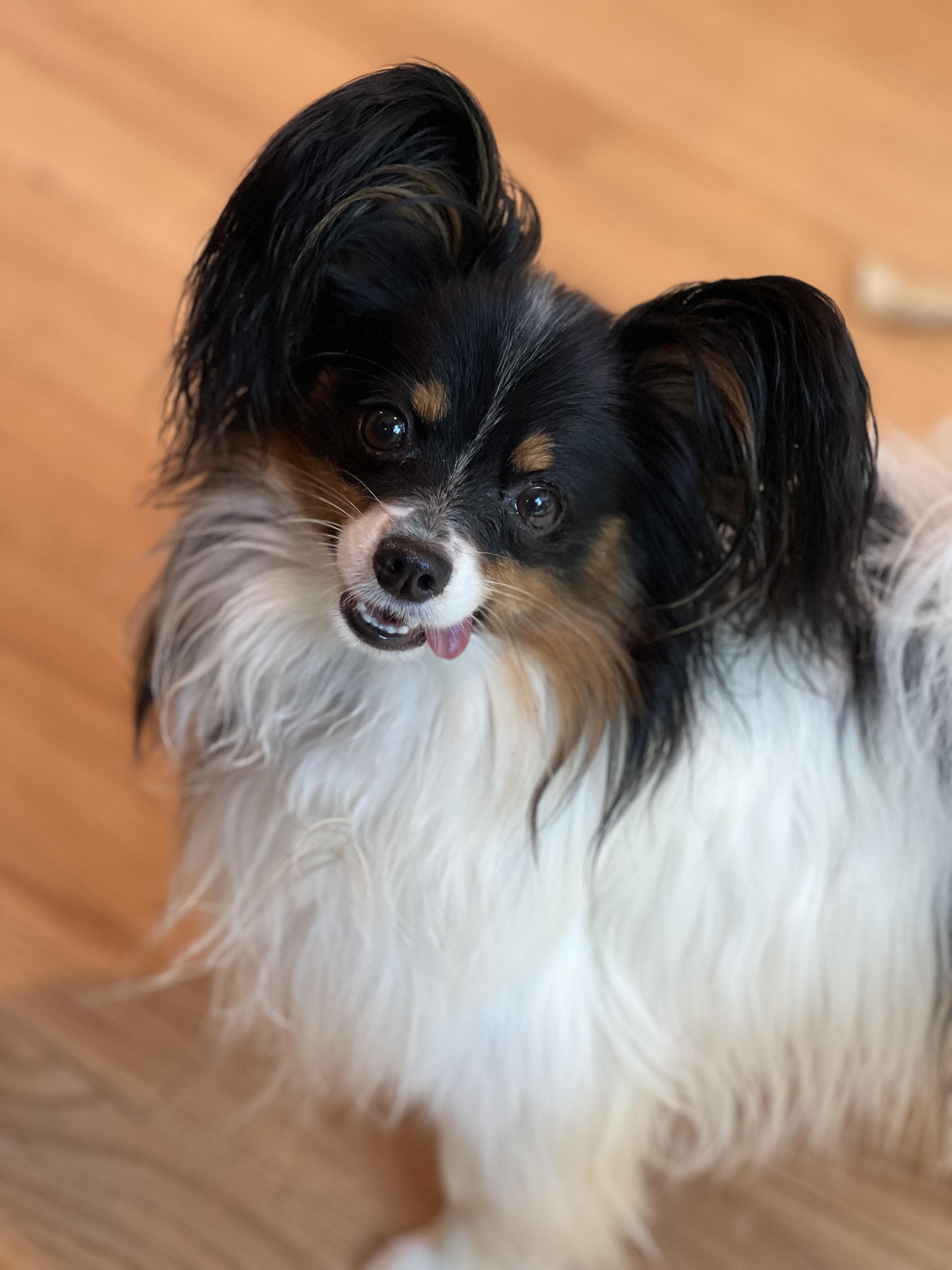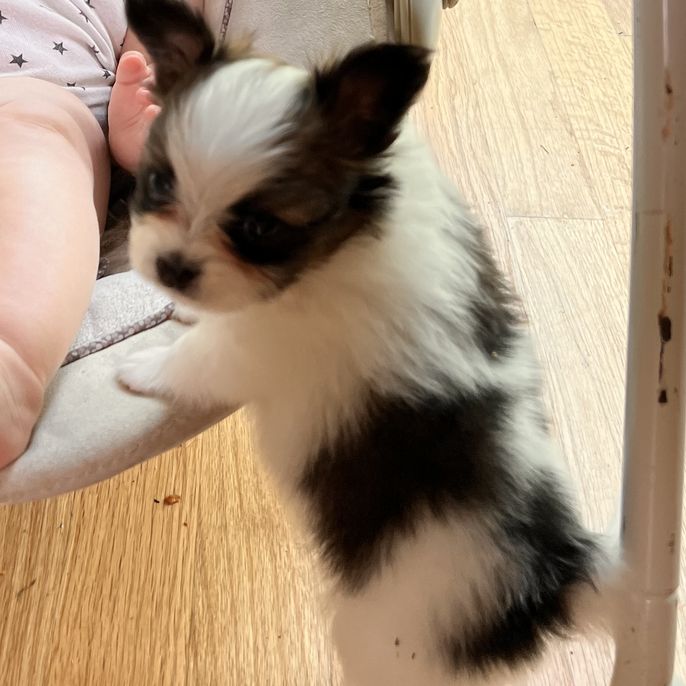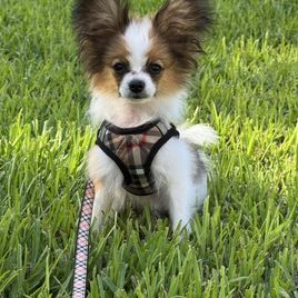 Maverick is a silly, tiny, energetic, friendly, fast, smart papillon! He loves our children and plays with everyone including our cat, puppies, and Jubilee. He’s the greeting committee for guests also! He has completed obedience training as well!