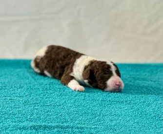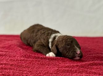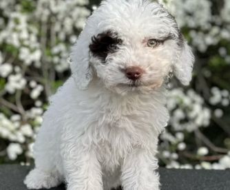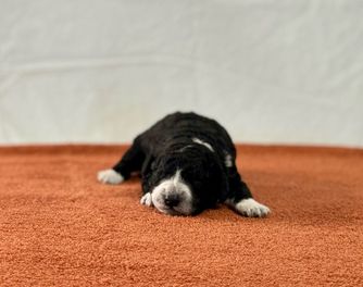 Our Spanish Water Dog puppies include white and black, white and beige w/brown nose, brown and white, black and white, beige and white w/brown nose, and beige and white w/black nose. Bernedoodle puppies are black and white. Colors will vary depending on the parent dogs.