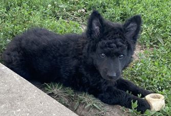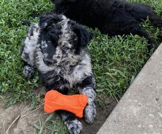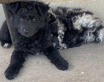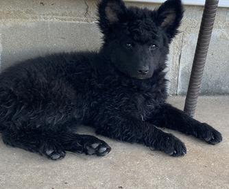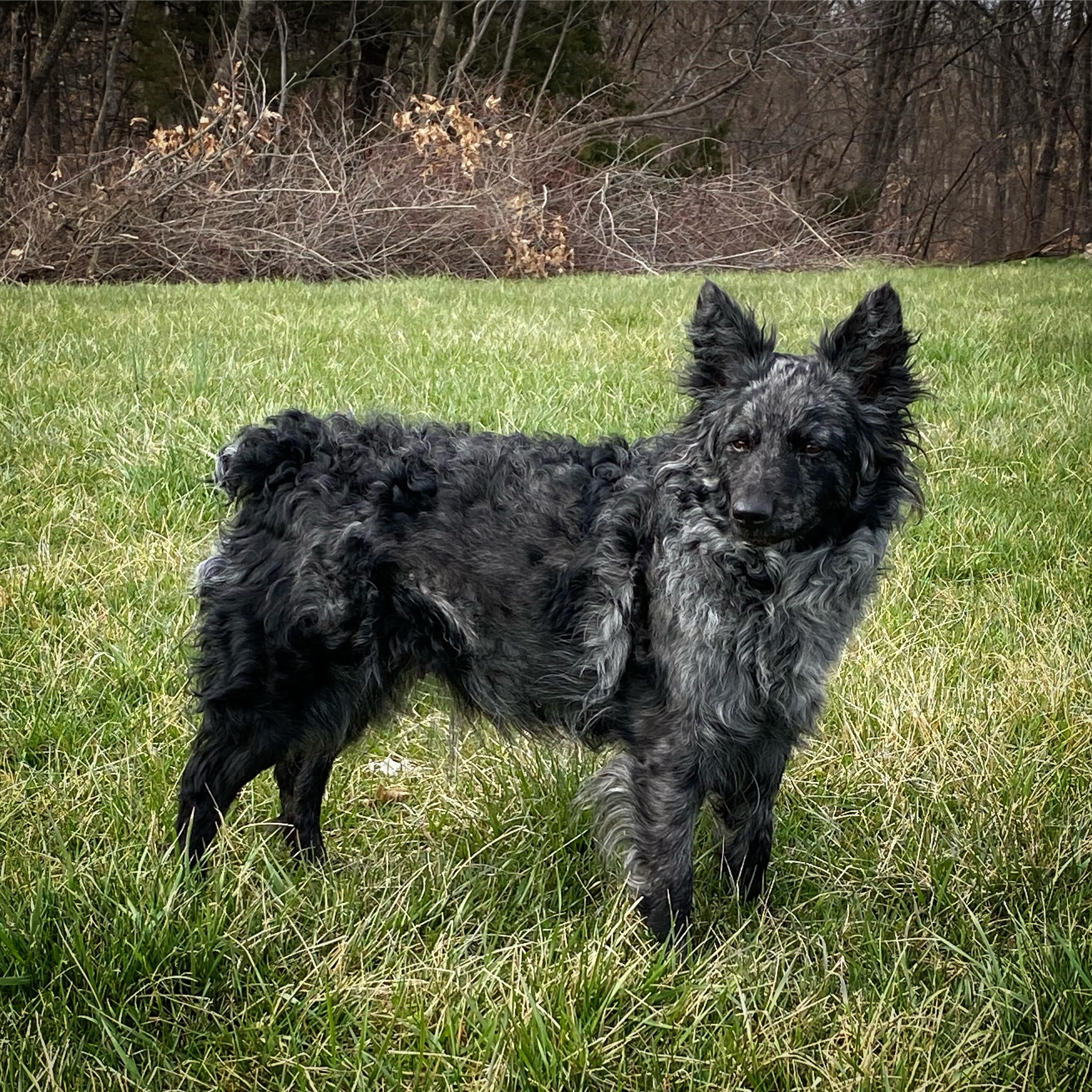 Suka was purchased from BJ Gross, Phoenix, AZ. It was the best decision we have ever made because Suka made us fall in love with the Mudi breed! Suka is high energy mostly when she is outside with a high drive. She has an off switch once she comes inside. She is on the smaller size of the standard, weighing 22lbs and 16.5” height. Her coat is a beautiful black merle and is soft. She loves to go on car rides, she enjoys working and helping when getting hay bales from field, playing with her Mudi sister (Coda), jump/climb up on things as high as she can, loves to snuggle but also enjoys some distance, and now her new love is her new babies!