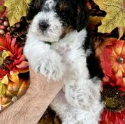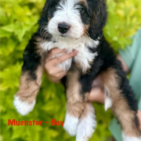 Our Bernedoodle puppies are tri-color. Bernese Mountain Dog puppies are black rust and white. Golden Retriever puppies are light golden. Goldendoodle puppies include cream, red, black, merle, and parti. Pembroke Welsh Corgi puppies include white and black and black and tan. Poodle puppies include white and parti. Colors will vary depending on the parent dogs.