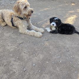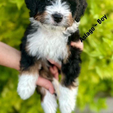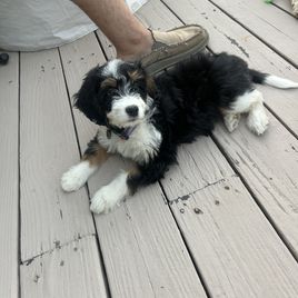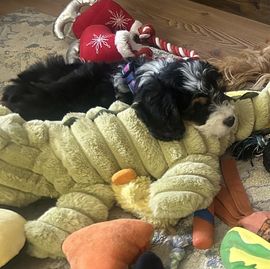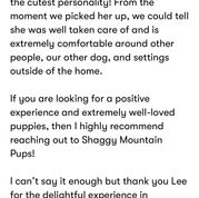 I can’t express how wonderful it was to work with Lee! This is exactly the type of experience I would wish for anyone who is looking for their next best fur-friend! I first interacted with Lee before the litter was even born, and he answered all our questions and more! He went above and beyond and communicated to us throughout the entire process. He provided us with weekly updates on the litter from birth to our 8-week pickup. We received videos, pictures, and provided us with facetime opportunities to help us make our choice on which puppy we would be introducing to our family. We are so happy to have Harley (Cheddar) as part of our family, and she has seamlessly transitioned into our home! She is such a sweet girl with the cutest personality! From the moment we picked her up, we could tell she was well taken care of and is extremely comfortable around other people, our other dog, and settings outside of the home. If you are looking for a positive experience and extremely well-loved puppies, then I highly recommend reaching out to Shaggy Mountain Pups! I can’t say it enough but thank you Lee for the delightful experience in choosing and bringing home our mini bernedoodle Harley (Cheddar).