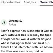 Lee was amazing and made the process smooth and clear. This was my first pet, and I never went through this type of process before but she answered every question that I had, provided me with all the paper work needed for his shots, etc, it was very easy from beginning to end. Now I always recommend her and the app Good Dog to everyone who asks about my perfect little pups!