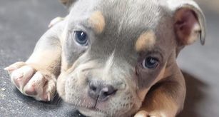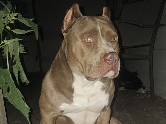Chocolate and white, amazing temperment. Almost perfect breed standard for the female American Bully. She stands 19in at the withers