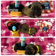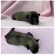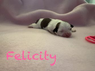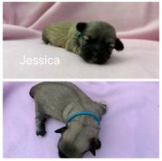 Ellie May is a sweet little southern belle! She is a white and grey brindle parti girl! She has the sweetest little temperament and is a very loving and protective momma!