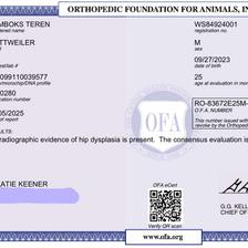 Sharp Ridge Rottweilers reports to performing the health tests below on their breeding dogs. Ask your breeder about the tests performed on the parents of your litter. Learn more about health testing for Rottweilers.