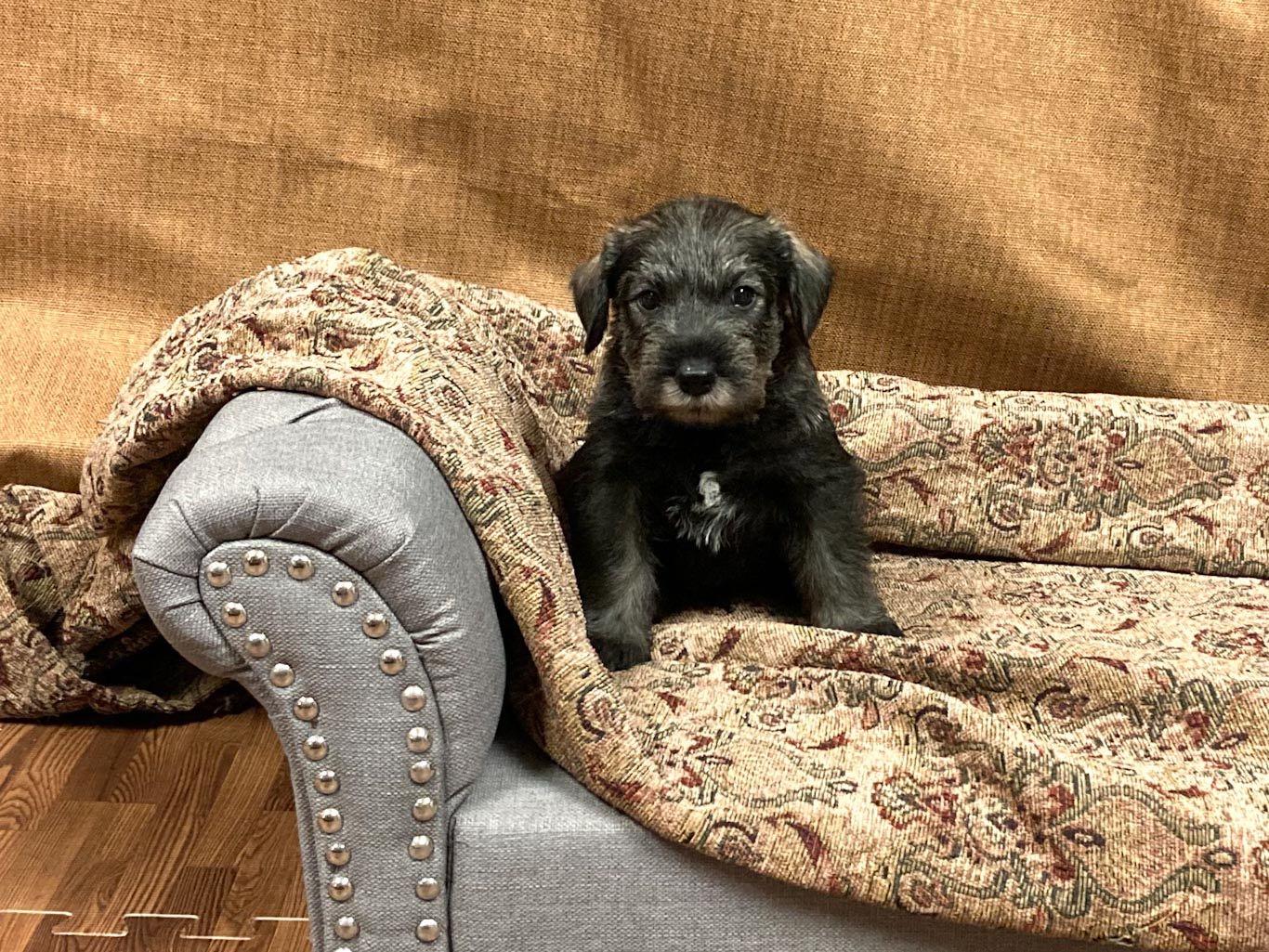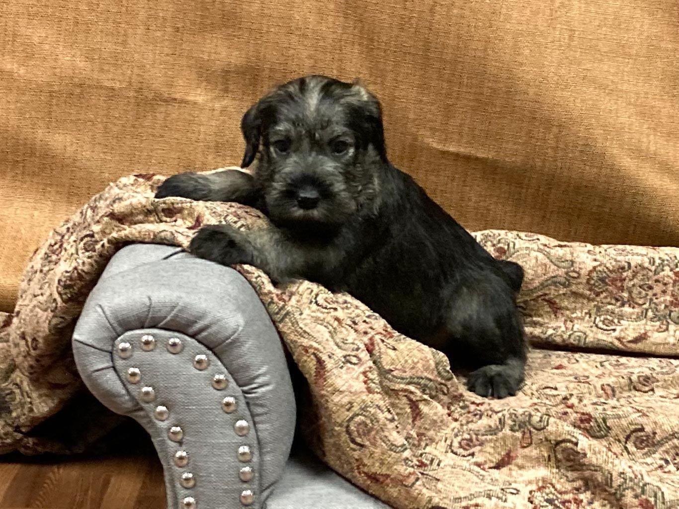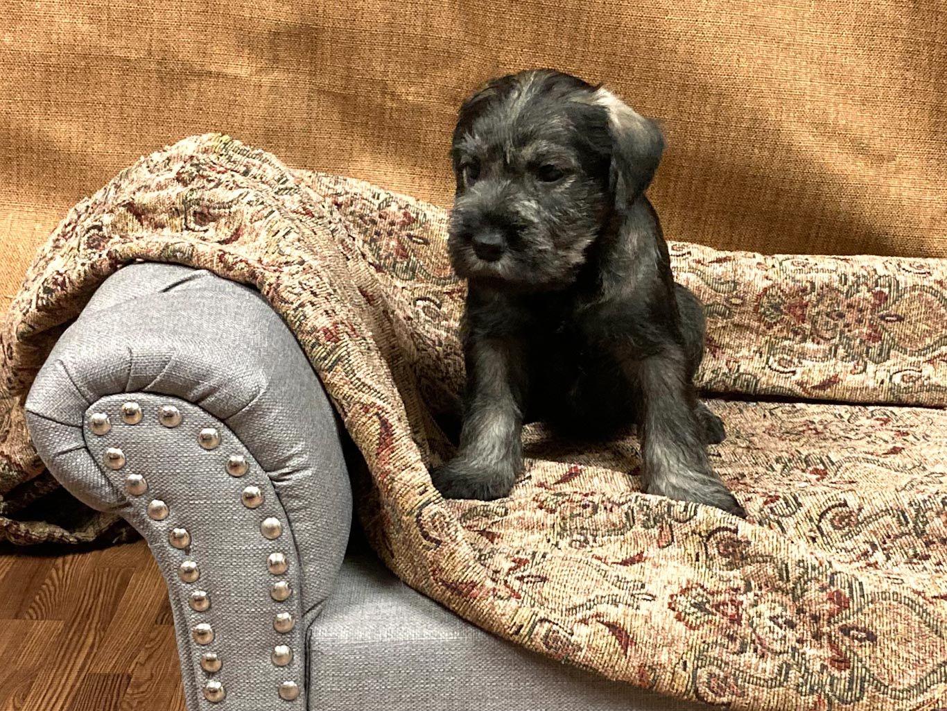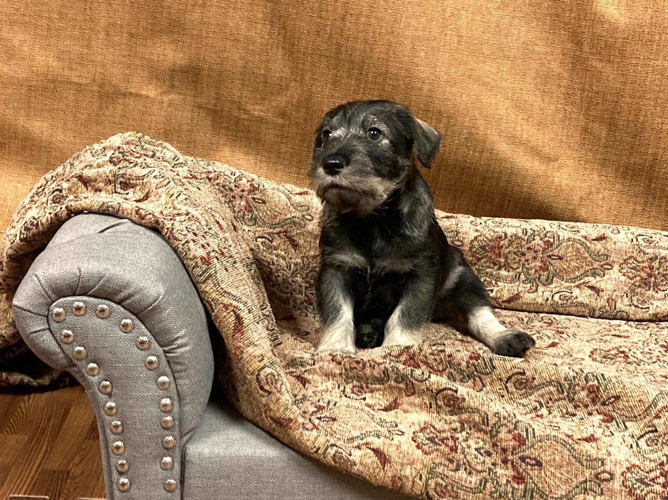 Our Miniature Schnauzer puppies include salt and pepper, black and silver, and black. Standard Schnauzer puppies are pepper and salt. Colors will vary depending on the parent dogs.