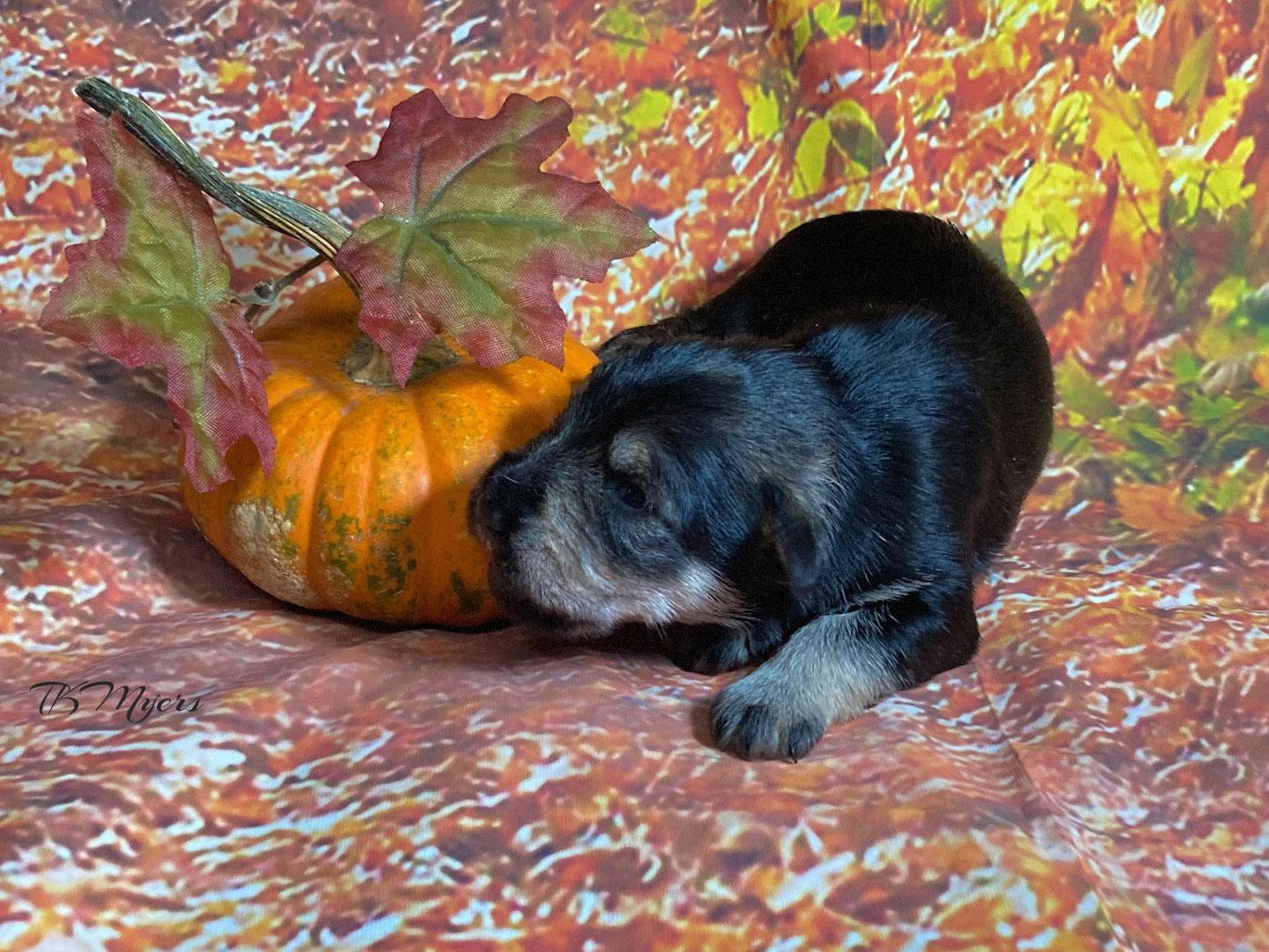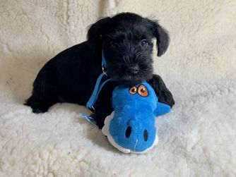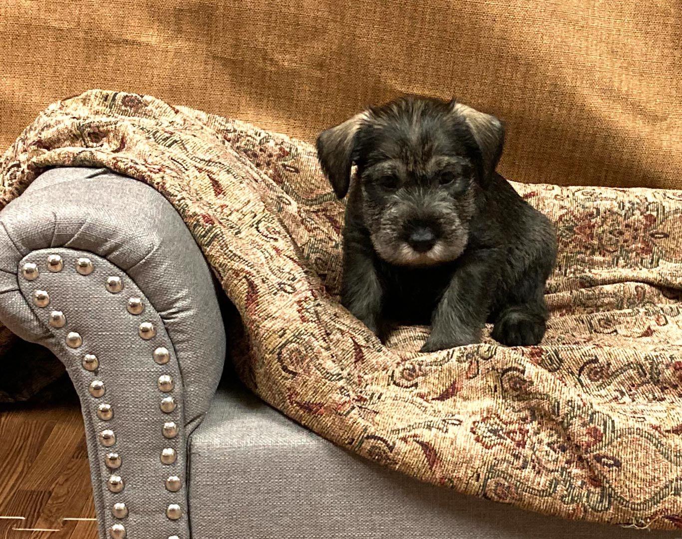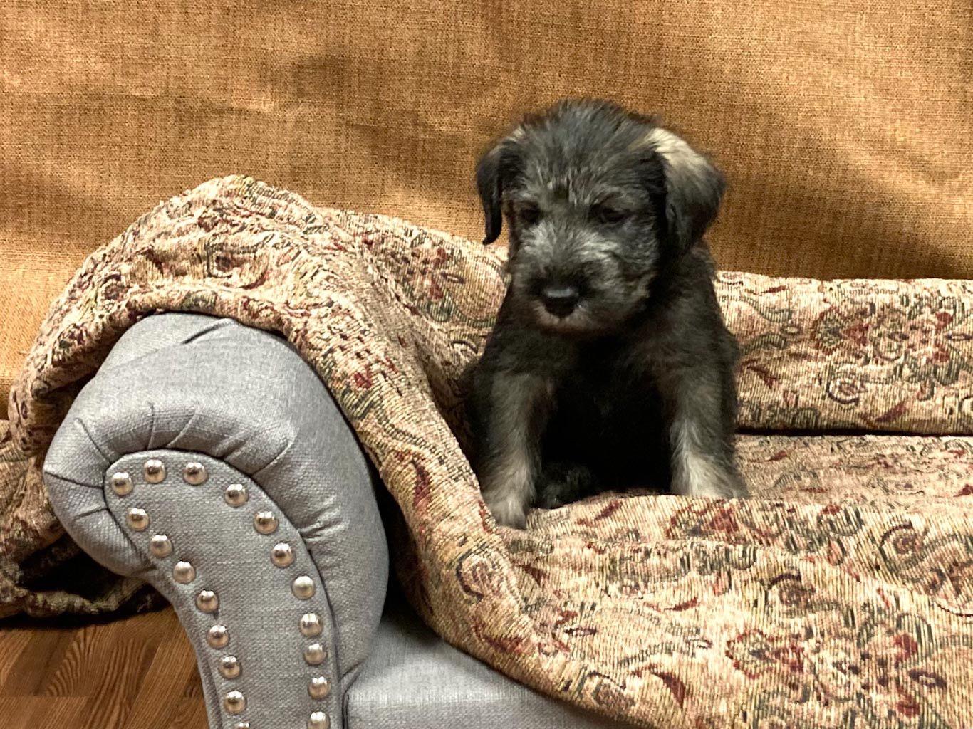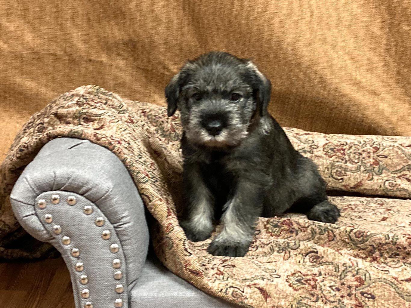 Our Miniature Schnauzer puppies include salt and pepper, black and silver, and black. Standard Schnauzer puppies are pepper and salt. Colors will vary depending on the parent dogs.