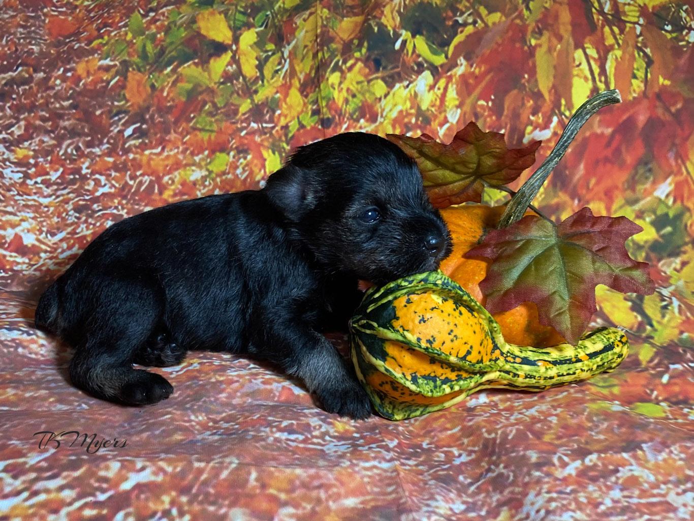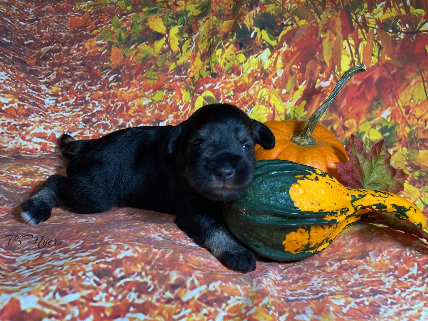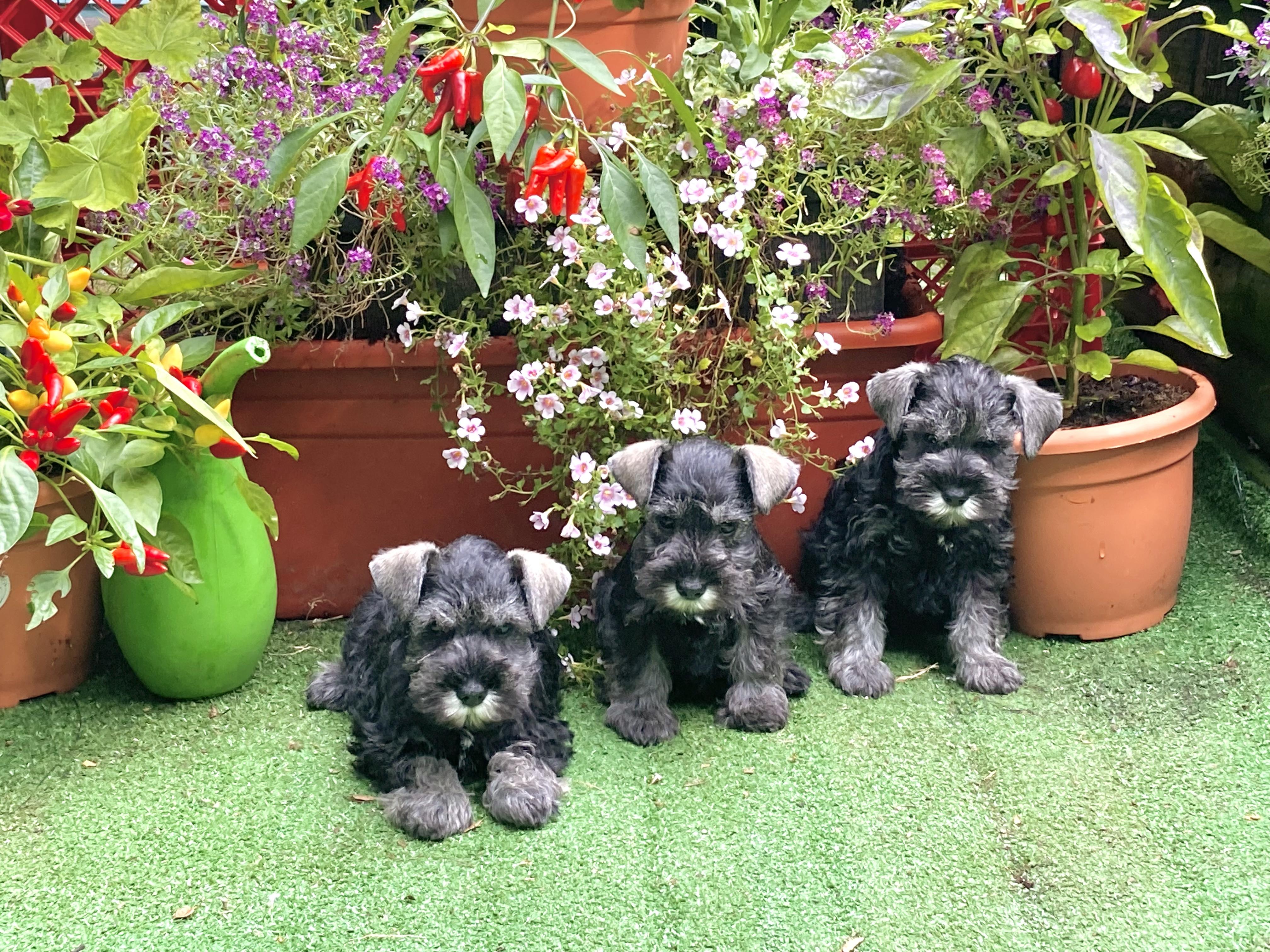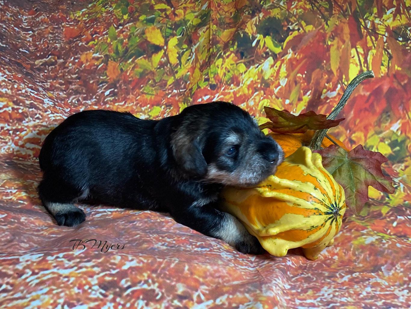 Our Miniature Schnauzer puppies include salt and pepper, black and silver, and black. Standard Schnauzer puppies are pepper and salt. Colors will vary depending on the parent dogs.