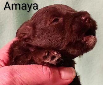 Liver tan color. Very thick coat. Anabel is a laid back, calm girl. She is so sweet to anyone she comes around.