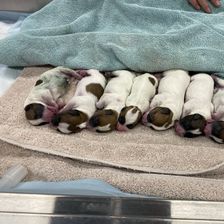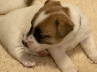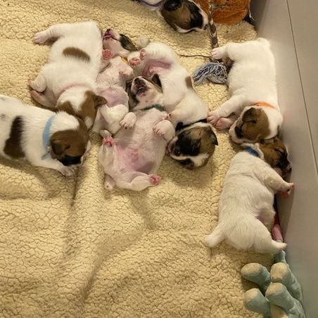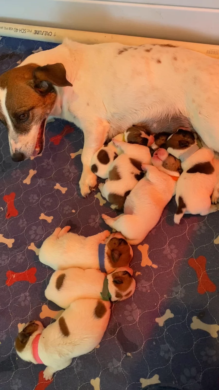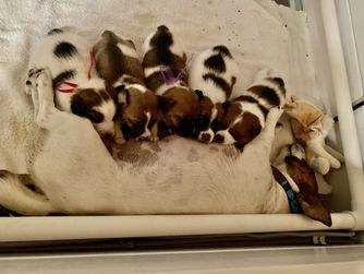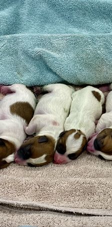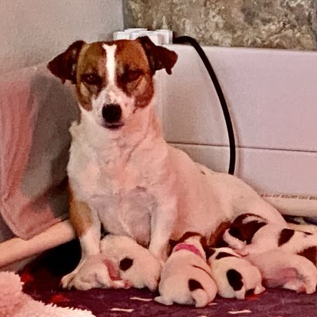 Pippin is my love, a great mother, and she comes out to horse barn daily and sticks by my side. She loves truck rides, golf cart or tractor 🚜 rides. She’s very savy about horses and hunts small animals like mice and rabbits along with our other JRT’s. She loves bouncing through fresh año or lying in the sun. She’s a true four seasons girl. She’s had several litters and the owners of her pups are very happy with their special little ones !