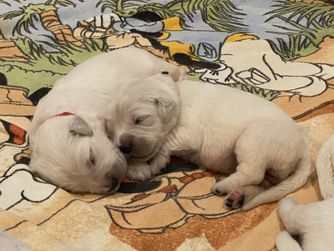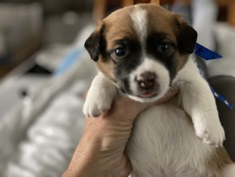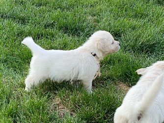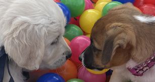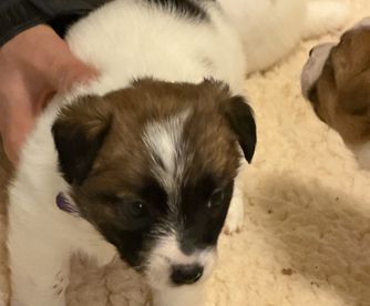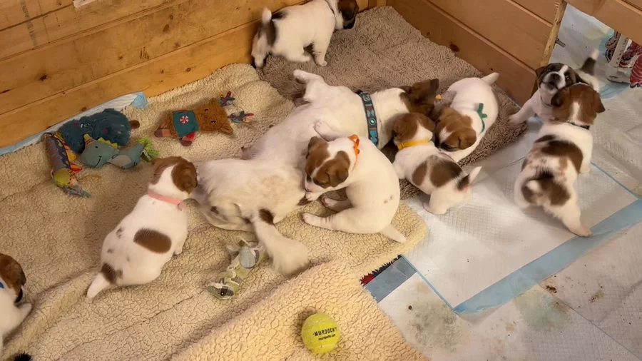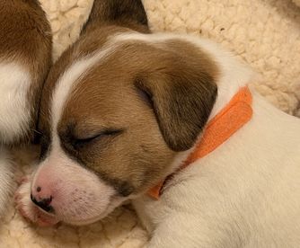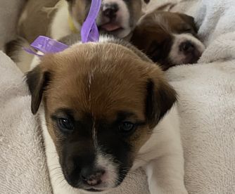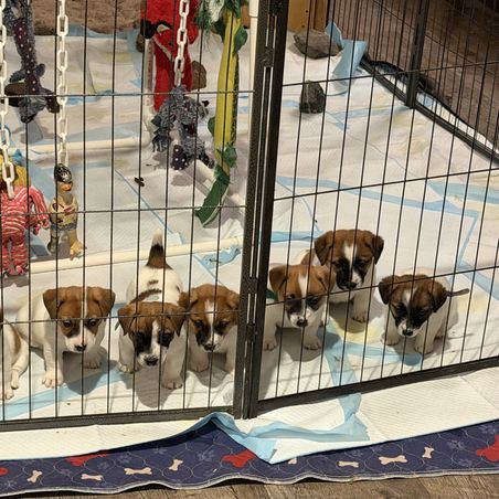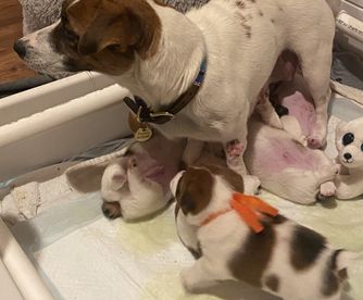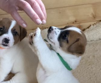 Our Golden Retriever puppies are light golden. Jack Russell Terrier puppies include brown and white and black and white. Colors will vary depending on the parent dogs.