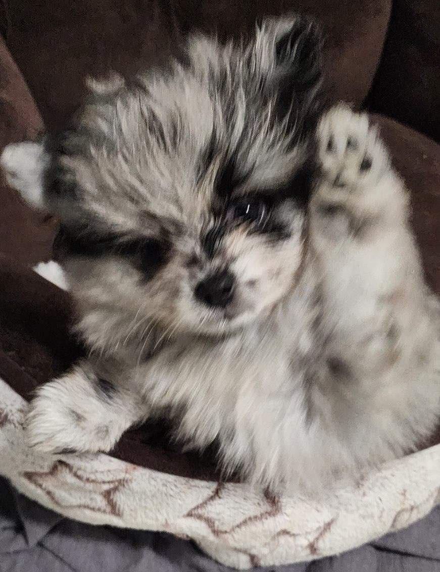 Registered AKC, with Outstanding show Bloodlines. She has a beautiful Merle and Tan coat with a blue chip in one eye. Weighs 6 lbs.