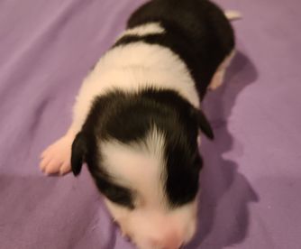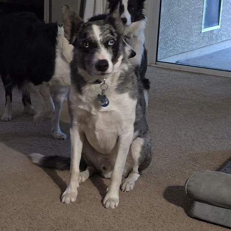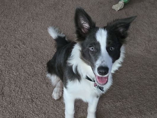 Soso is an energetic girl. She loves to play, run, herd and cuddle. She gives kisses on request. She's a gentle but energetic girl. She's a blue and white, mid length silky coat.