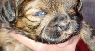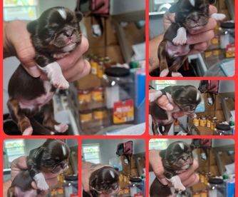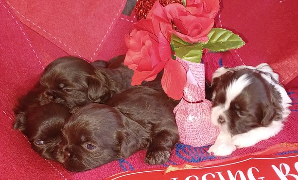 HE IS A CHOCOLATE DOBIE SHIHTZU WITH RED/GOLD DOBIE MARKINGS.